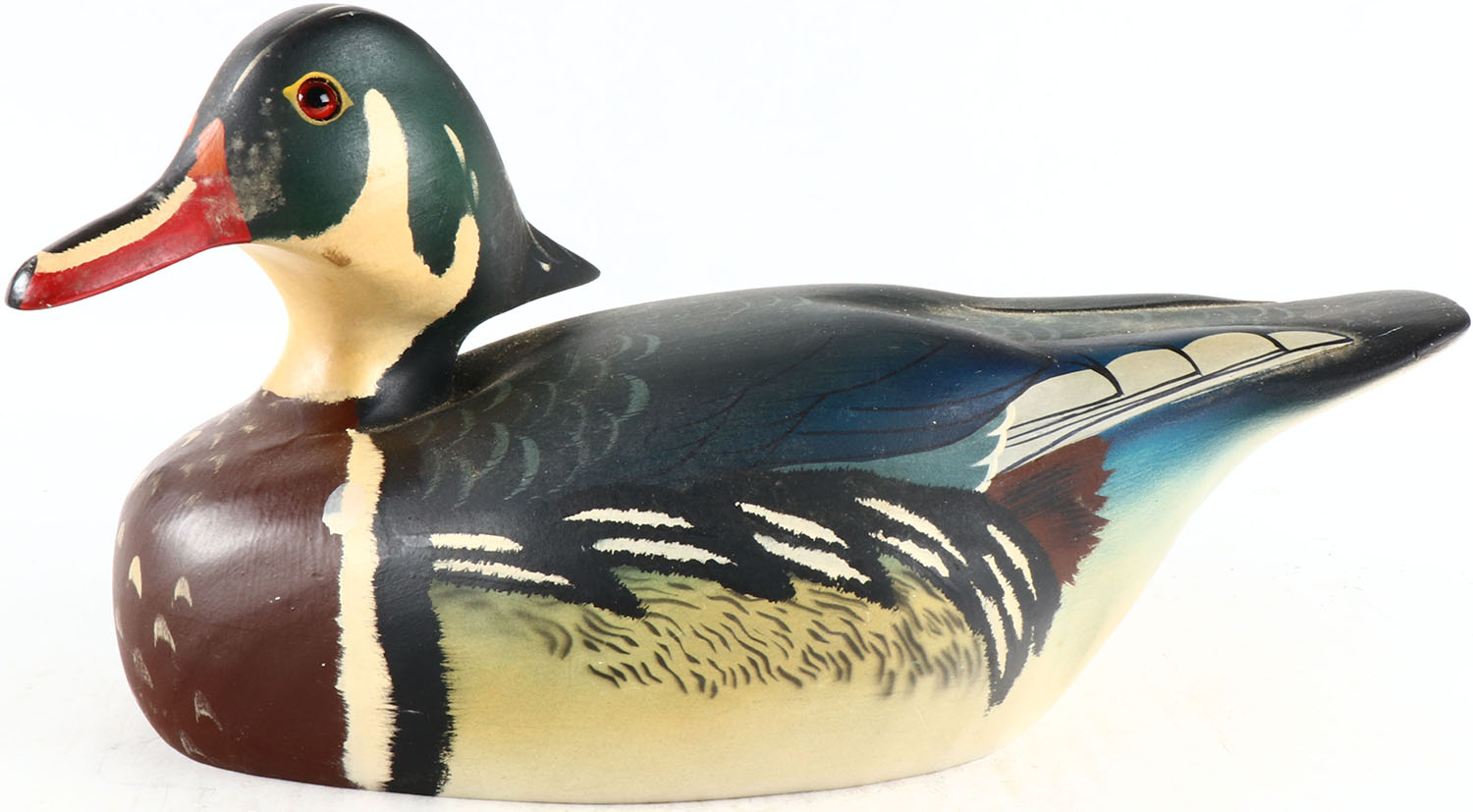 Woodduck Drake by unknown maker, glass eyes, solid wood, original paint, structurally excellent. Grade: MINT - Value: 50 to 100
