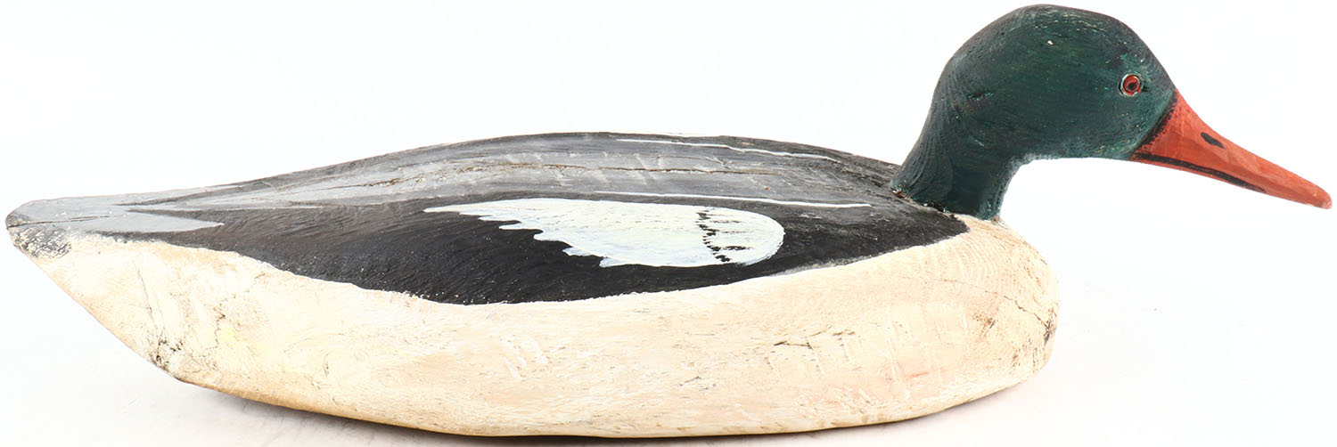Merganser by unknown maker, tack eyes, solid wood, repainted, has age cracks on entire body. Grade: Vey Good + - Value: 50 to 100