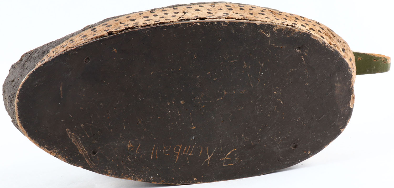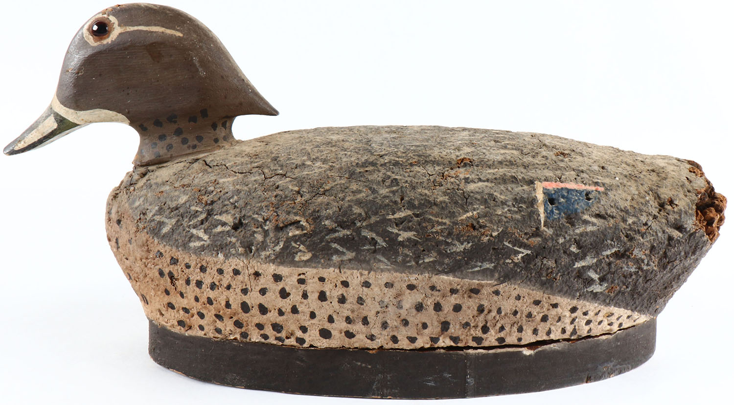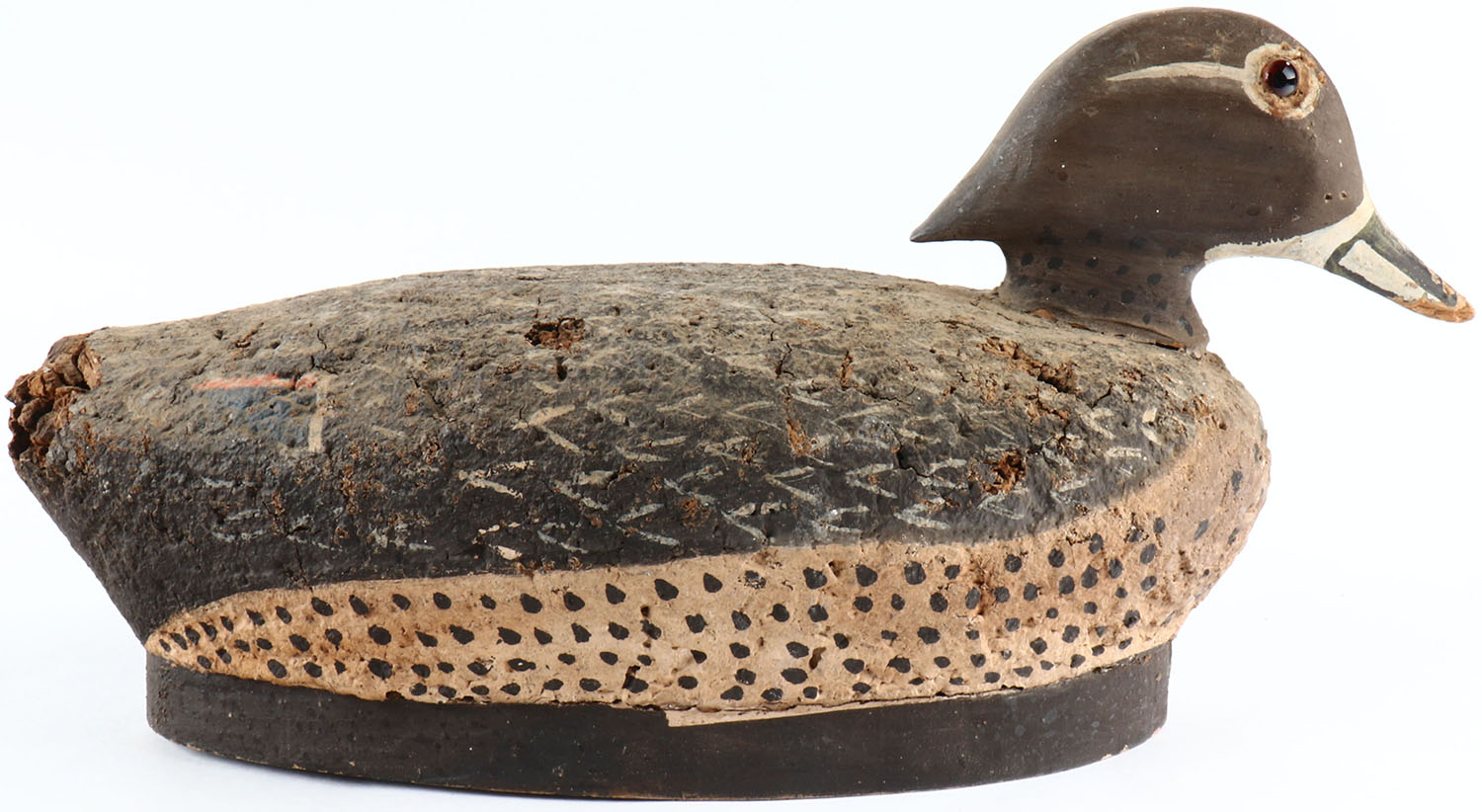 Woodduck Hen by F. Kimball, glass eyes, solid cork body, original paint, tail and bill are broken, signed on bottom. Grade: Very Good ++ - Value: 50 to 100