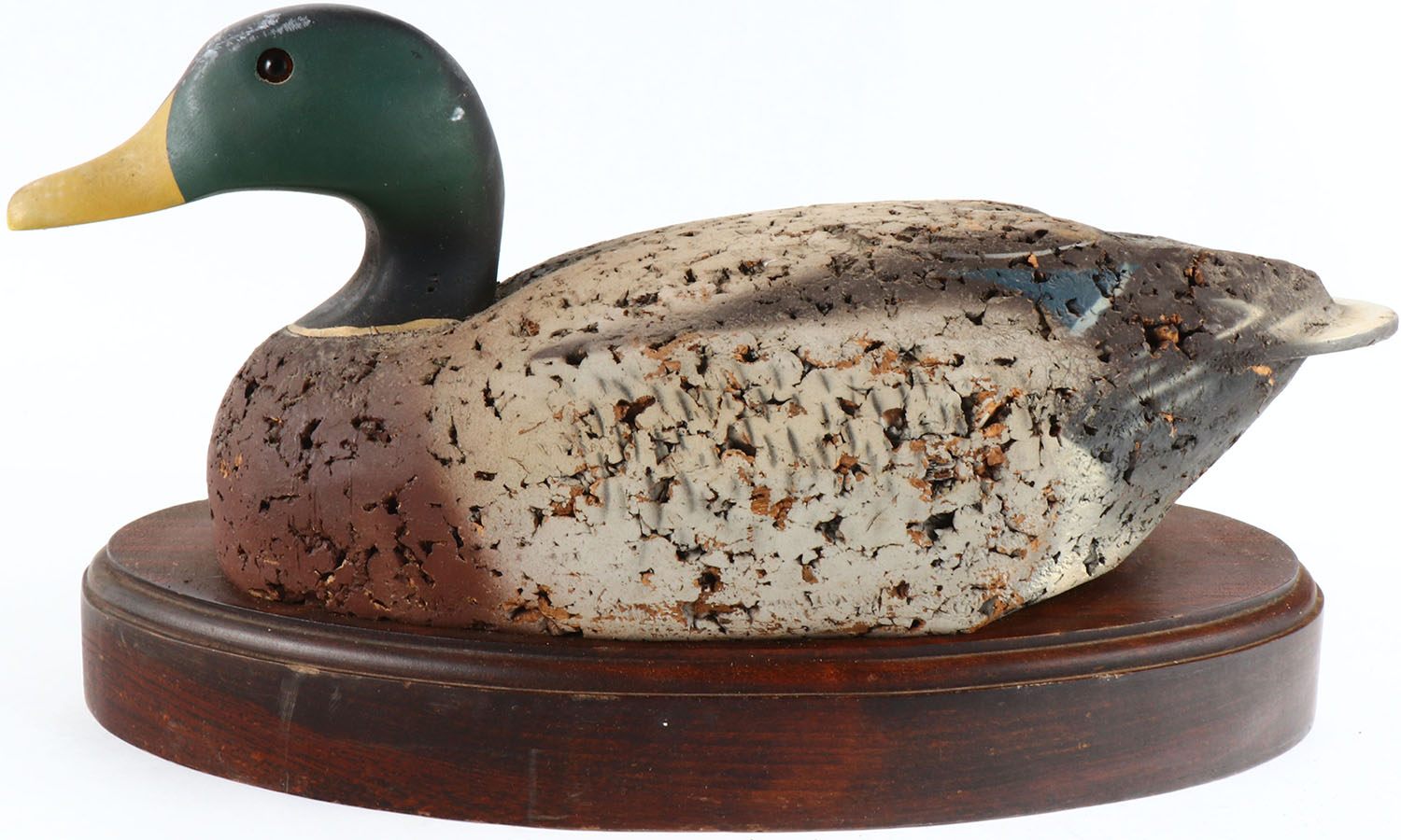 Mallard Drake by unknown maker, glass eyes, solid cork body on wood base, original paint, structurally excellent. Grade: Excellent - Value: 50 to 100