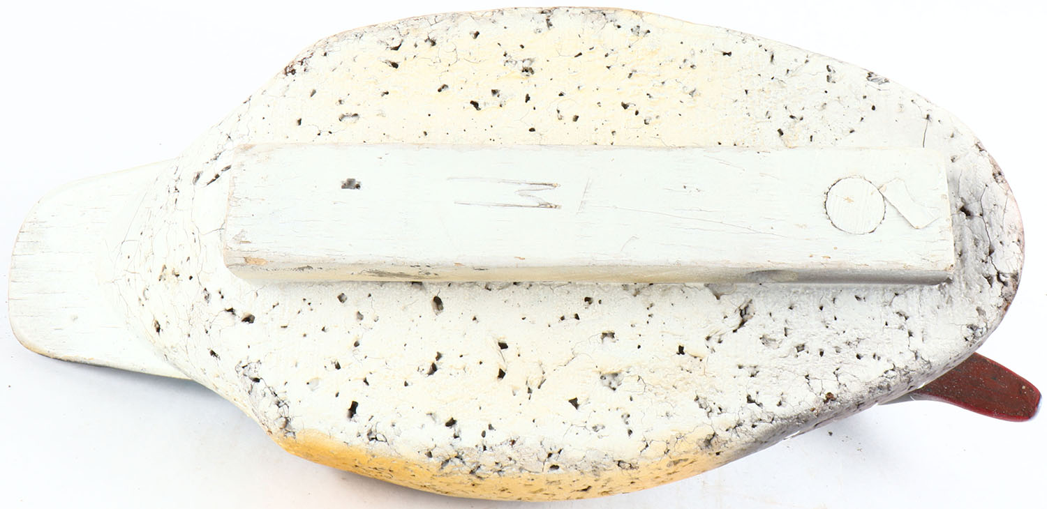 Woodduck Drake by M, glass eyes, solid cork body, original paint, structurally excellent, branded M on bottom. Grade: Excellent + - Value: 50 to 100