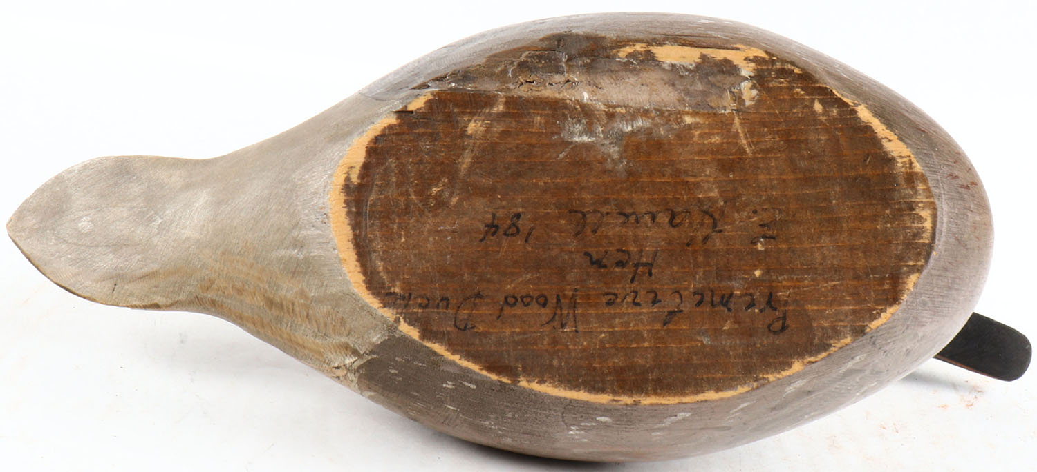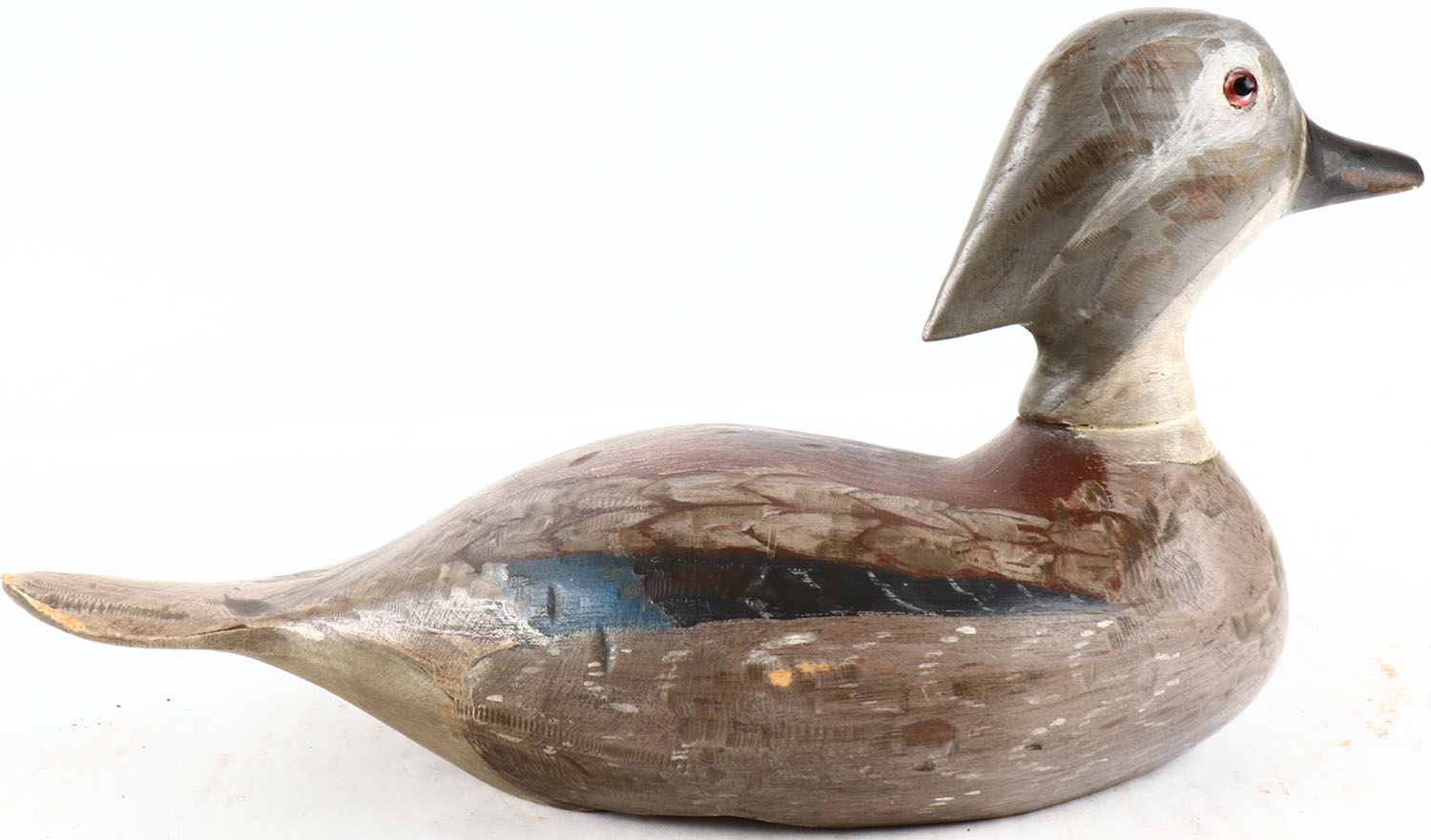Woodduck Hen by E. Howell, glass eyes, solid wood, original paint, structurally excellent, signed on bottom. Grade: MINT - Value: 50 to 100