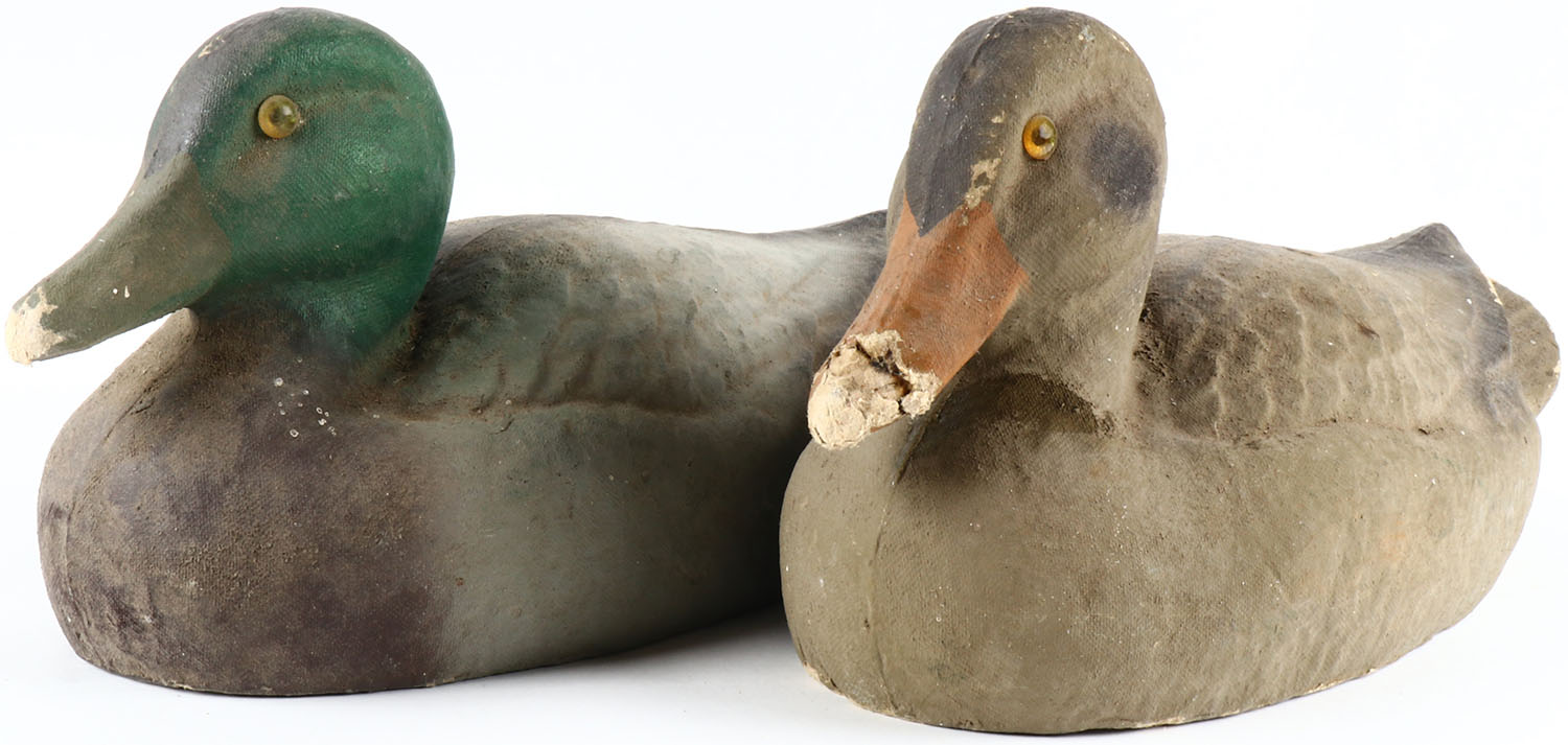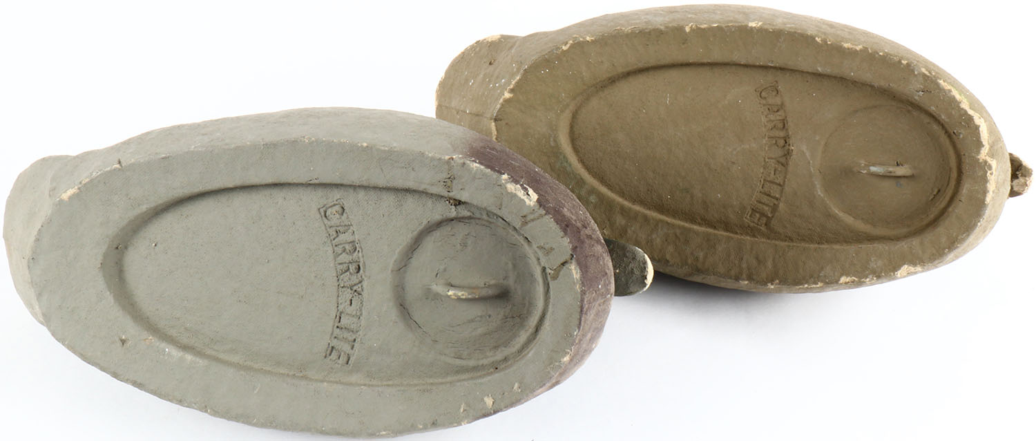 Pair of Mallard Paper Mache' Decoys by Carry Lite Decoys, glass eyes, original paint, wear to bill area. Grade: Very Good - Value: 6 to 30
