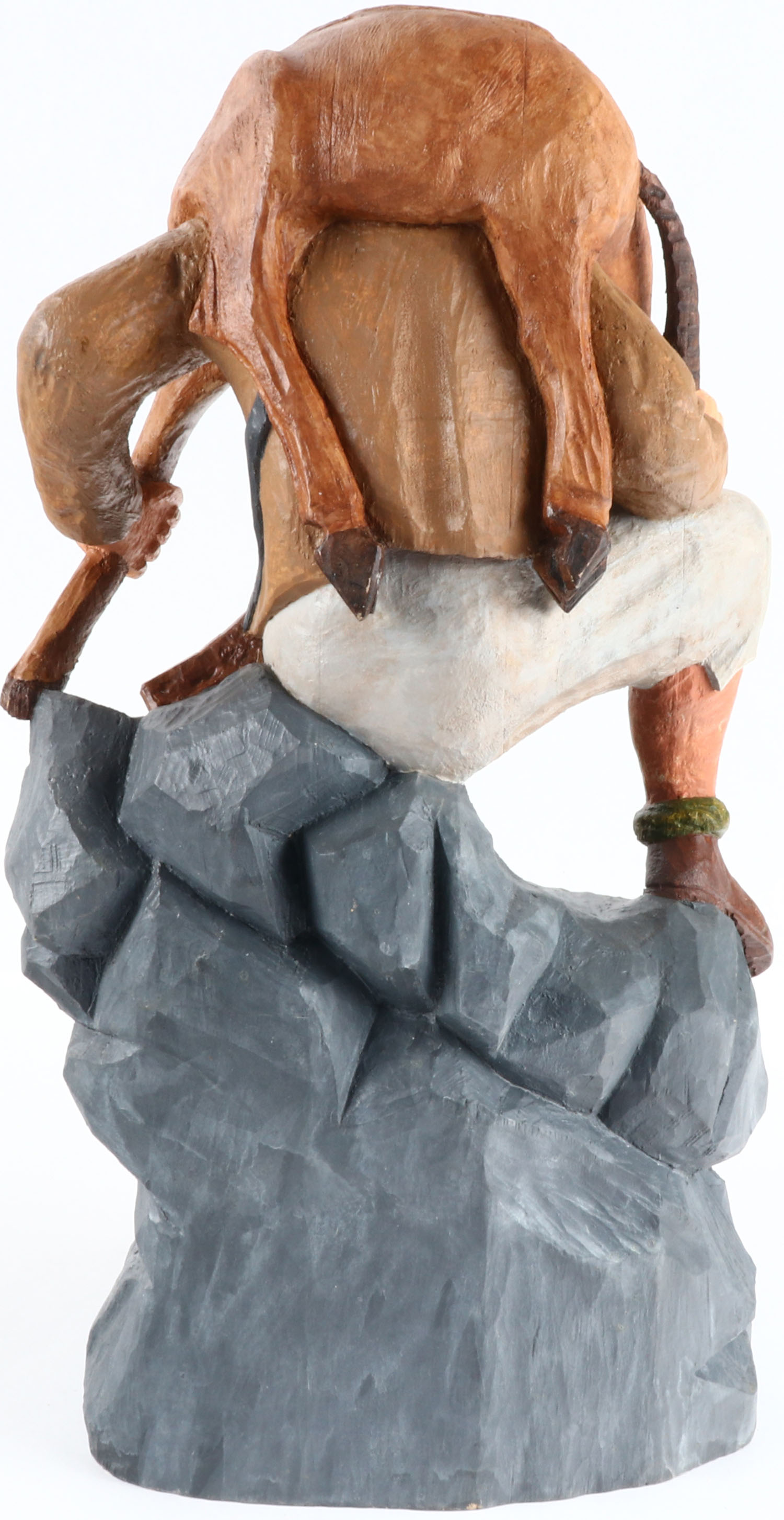 Hand carved & painted by G.W., has hunters carrying a Blesbok? With gun on front, 10'' x 17''. Grade: Excellent - Value: 6 to 30