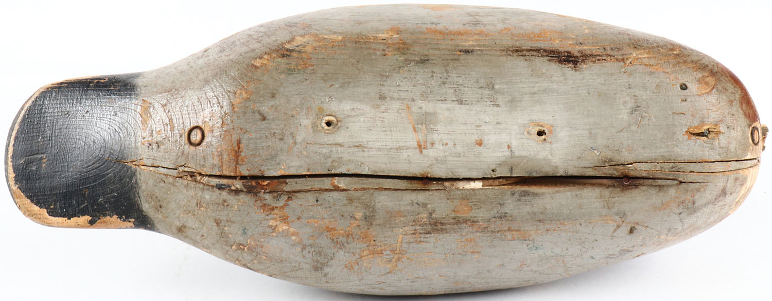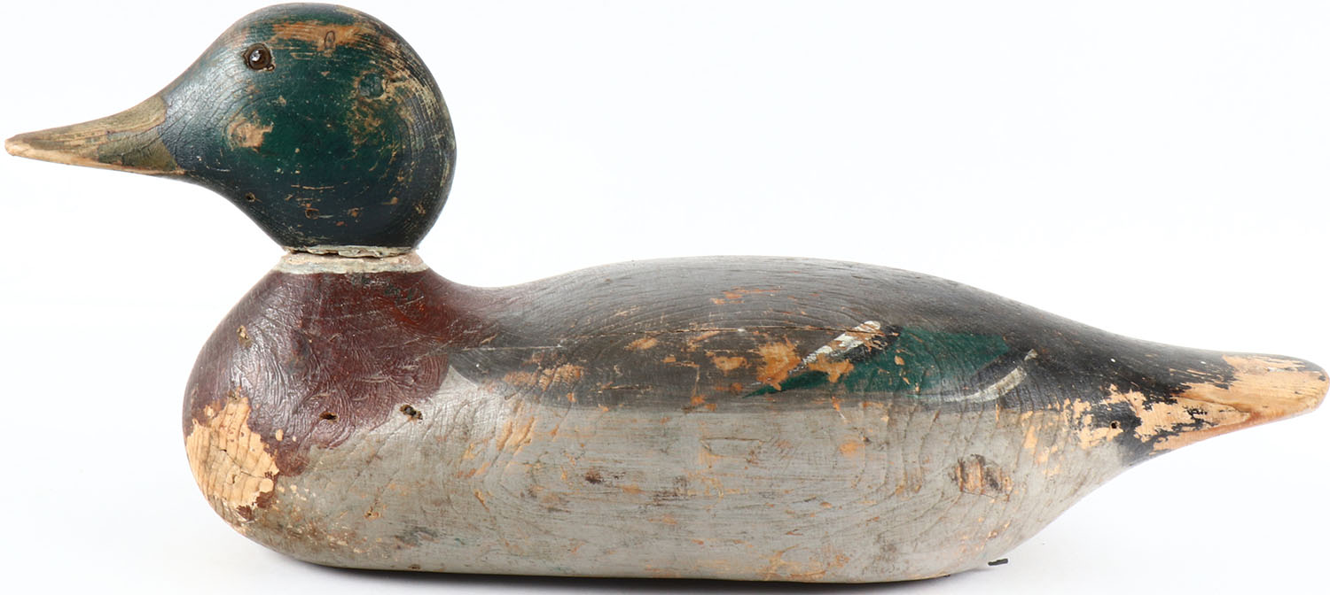 Mallard Drake by Mason Decoy Co., glass eyes, one eye is missing, solid wood, original paint, has chips in bill and age crack on bottom. Grade: Very Good + - Value: 50 to 200