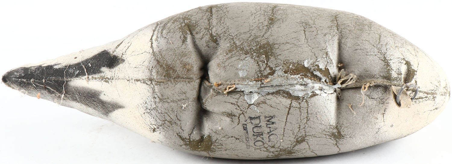 Pintail Drake by Macay Dukoy, glass eyes, canvas over cork, original paint, structurally excellent, well marked on bottom. Grade: Excellent + - Value: 10 to 50