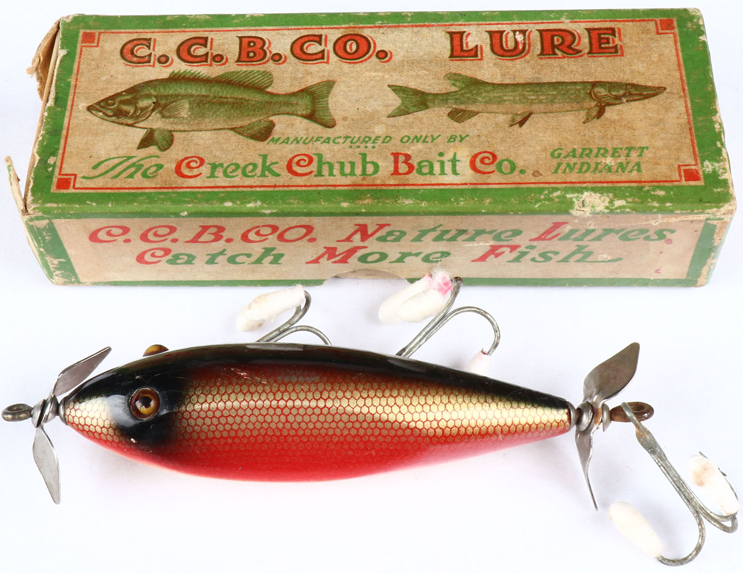 Creek Chub Injured Minnow, GE, wood lure in original box, red & gray scale finish, 3 hook, box shows age soiling. Grade: Excellent - Value: 10 to 50