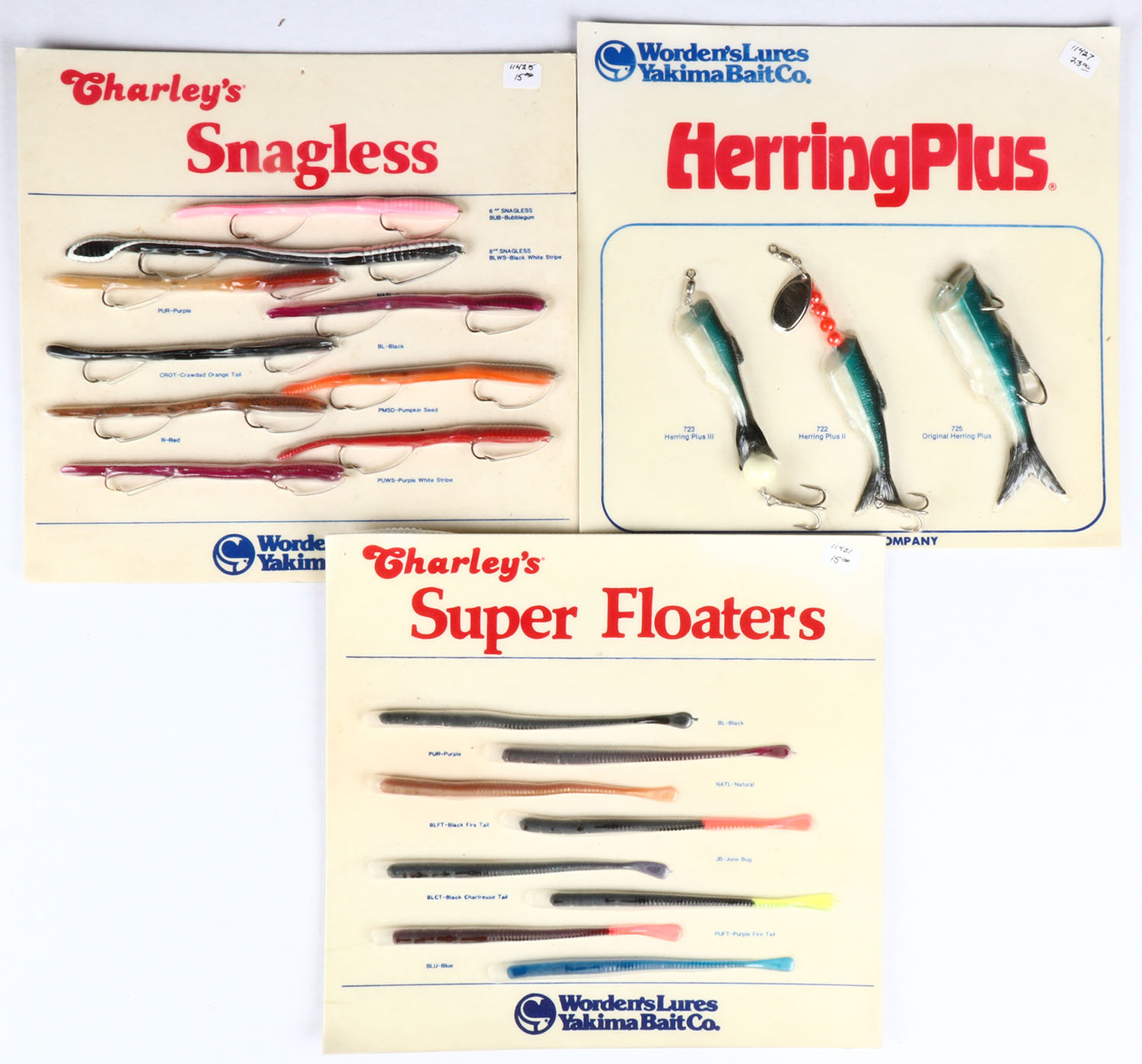Lot of 3 Worden's Lures Herring Plus, Super Floater, Snagless lures on card, 10'' x 10 1/2''. Grade: Excellent ++ - Value: 10 to 100