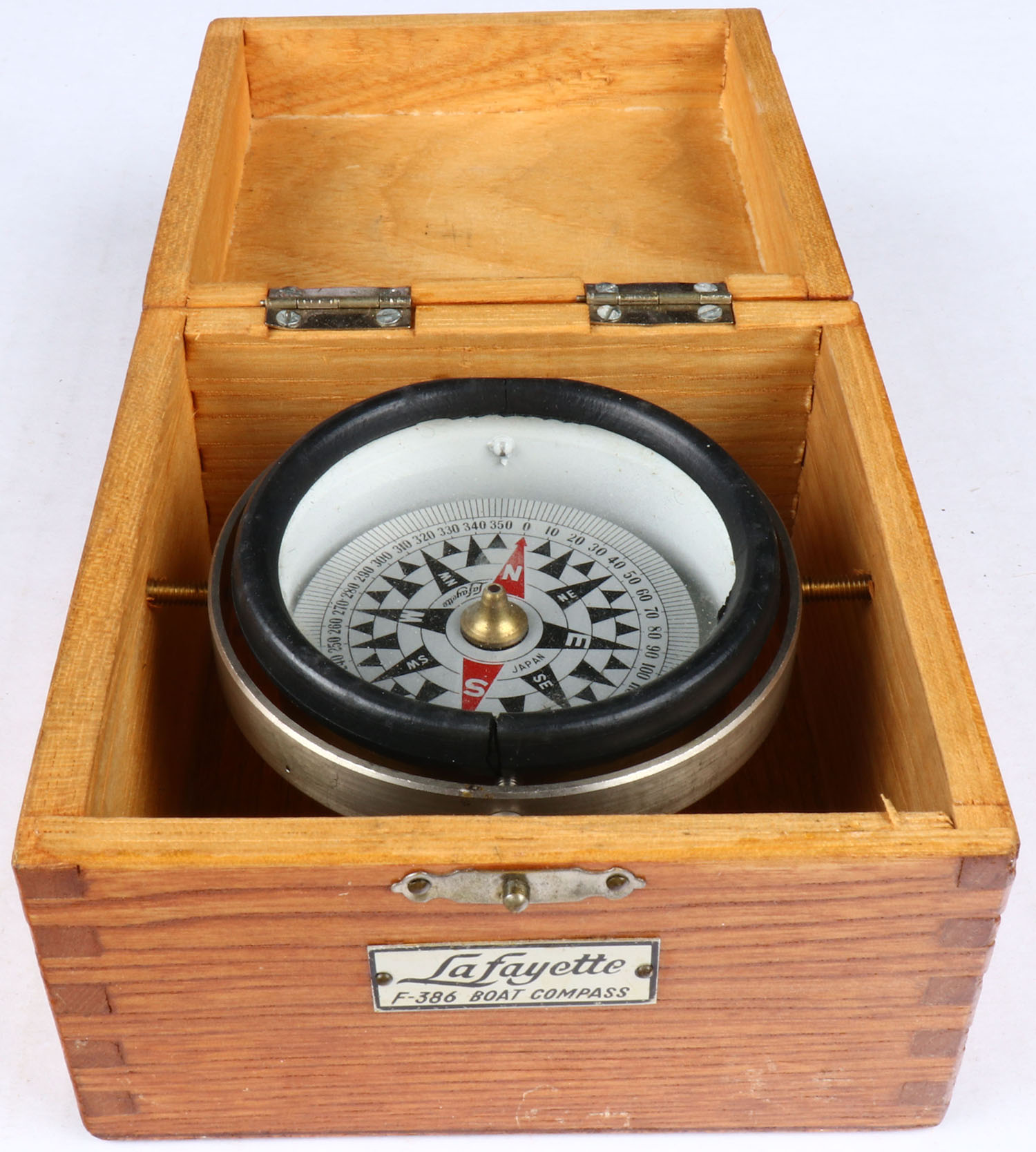 La Fayette F-386 Boat Compass in wood box, 4 3/4'' X 4 3/4'' X 3 1/2'', very nice box & compass works well. Grade: Excellent - Value: 30 to 200