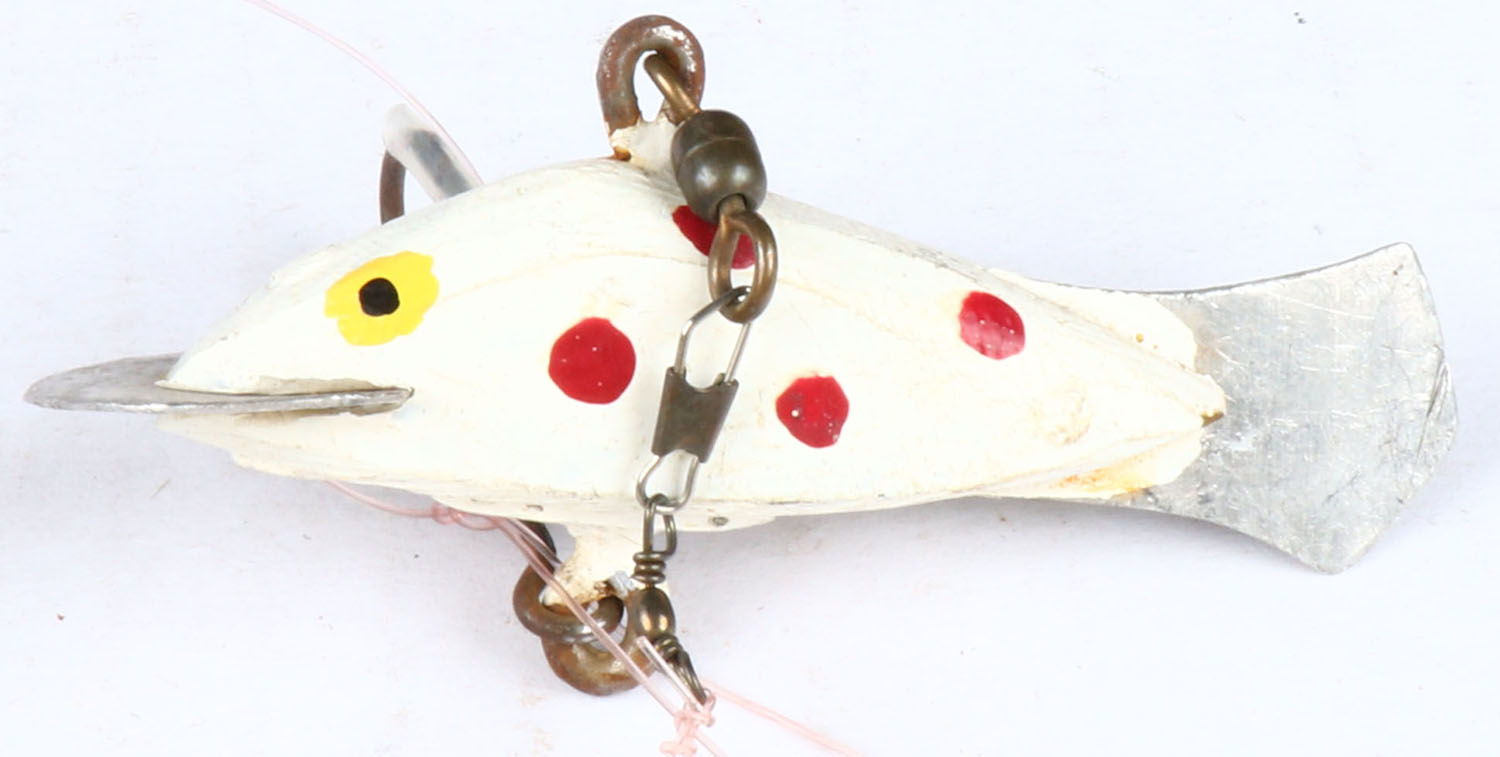 | Unmarked Ice Fishing Decoy, PE, 1 line tie, has 2 metal fins, 3 ...