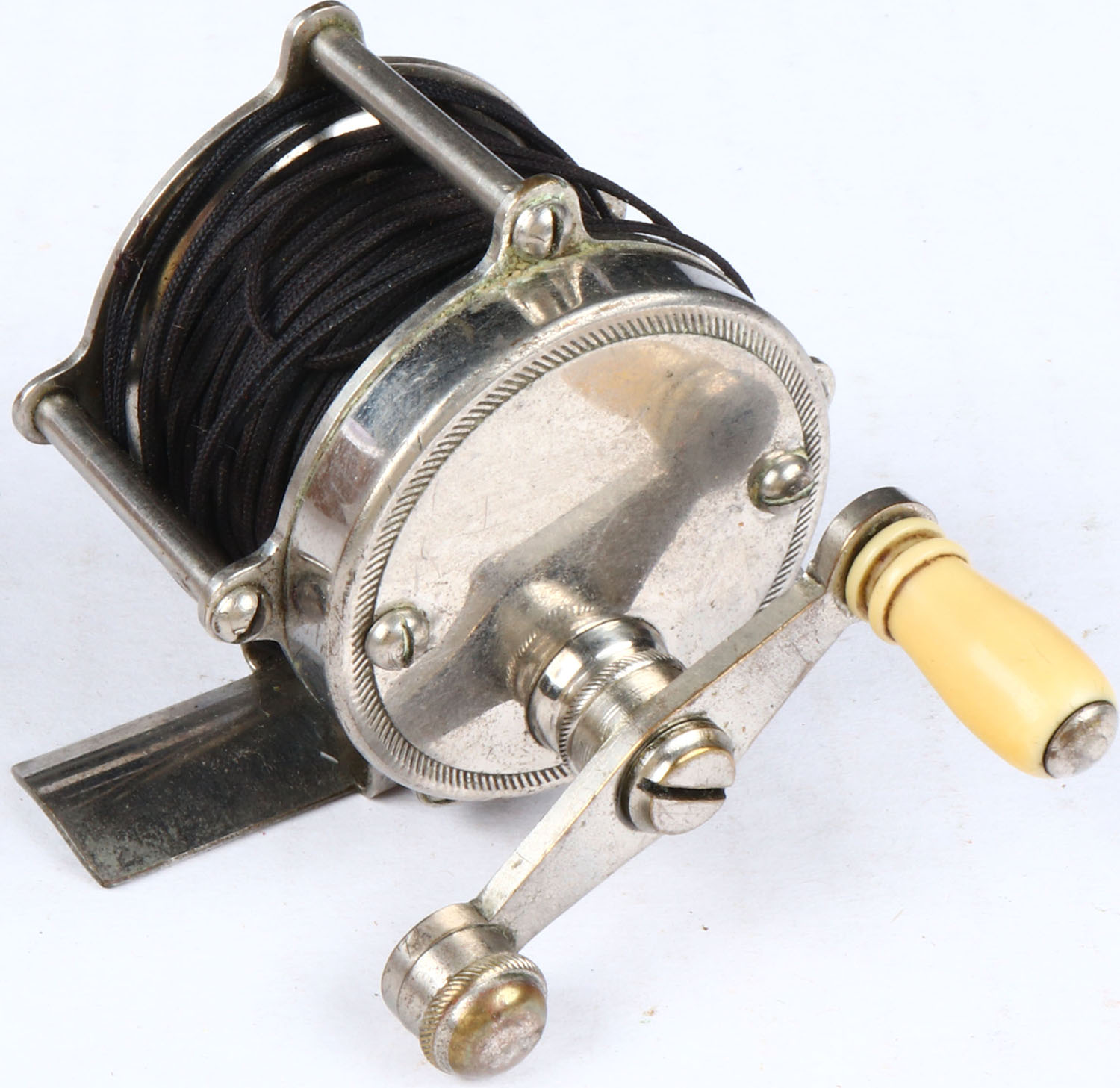 Small fishing reel, 40yds, single white bone handle, works well. Grade: Excellent - Value: 10 to 40