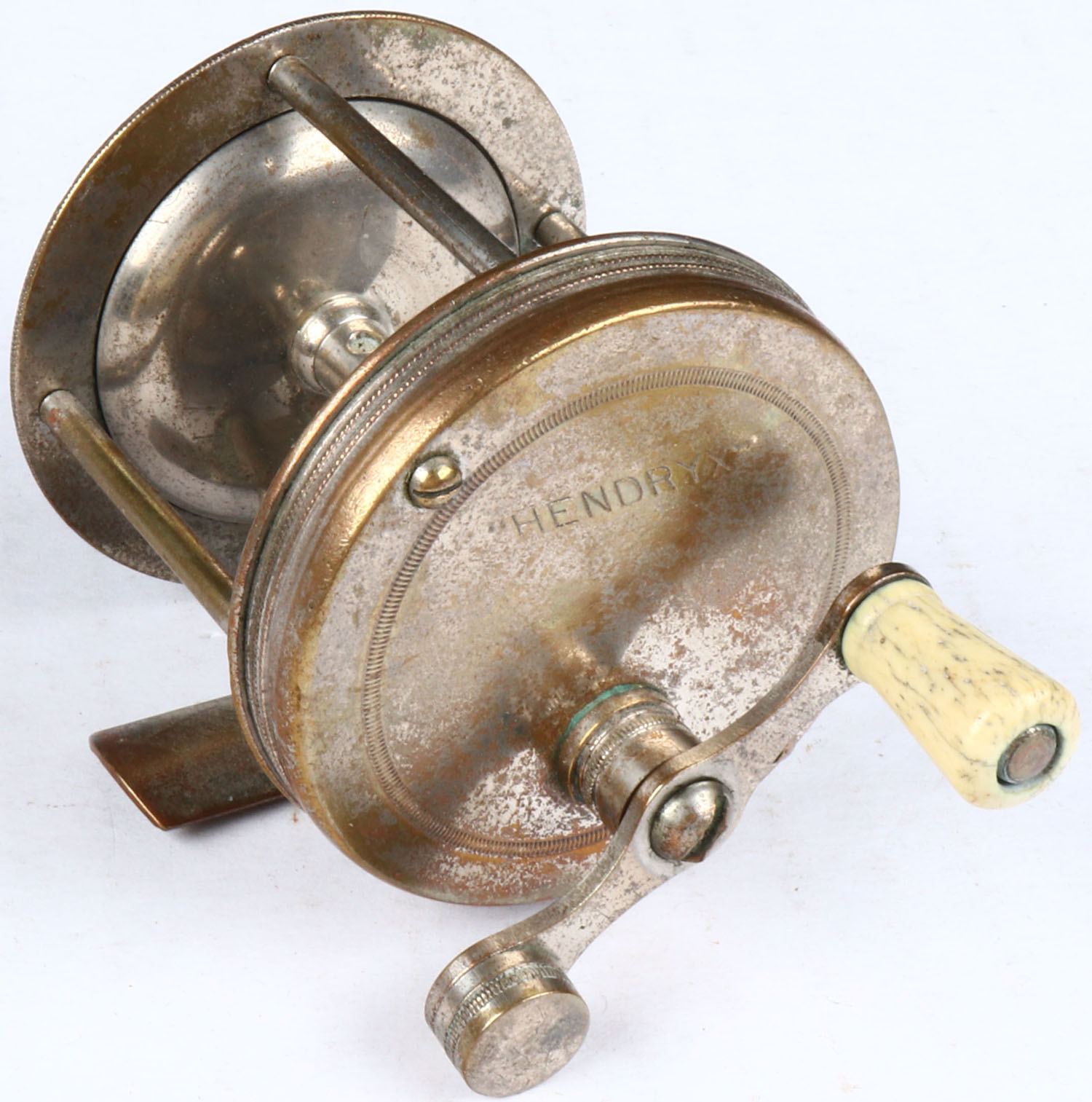 Hendryx casting reel, single white handle, 80yds, strong click but rough on the turn. Grade: Very Good - Value: 2 to 30