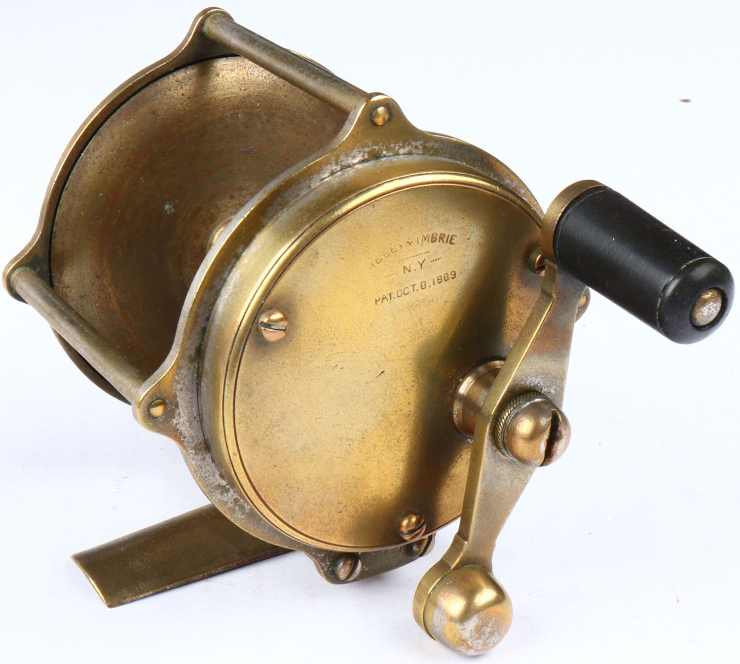 | Abbey & Imbrie NY brass reel, pat Oct 1889, black wood single h...
