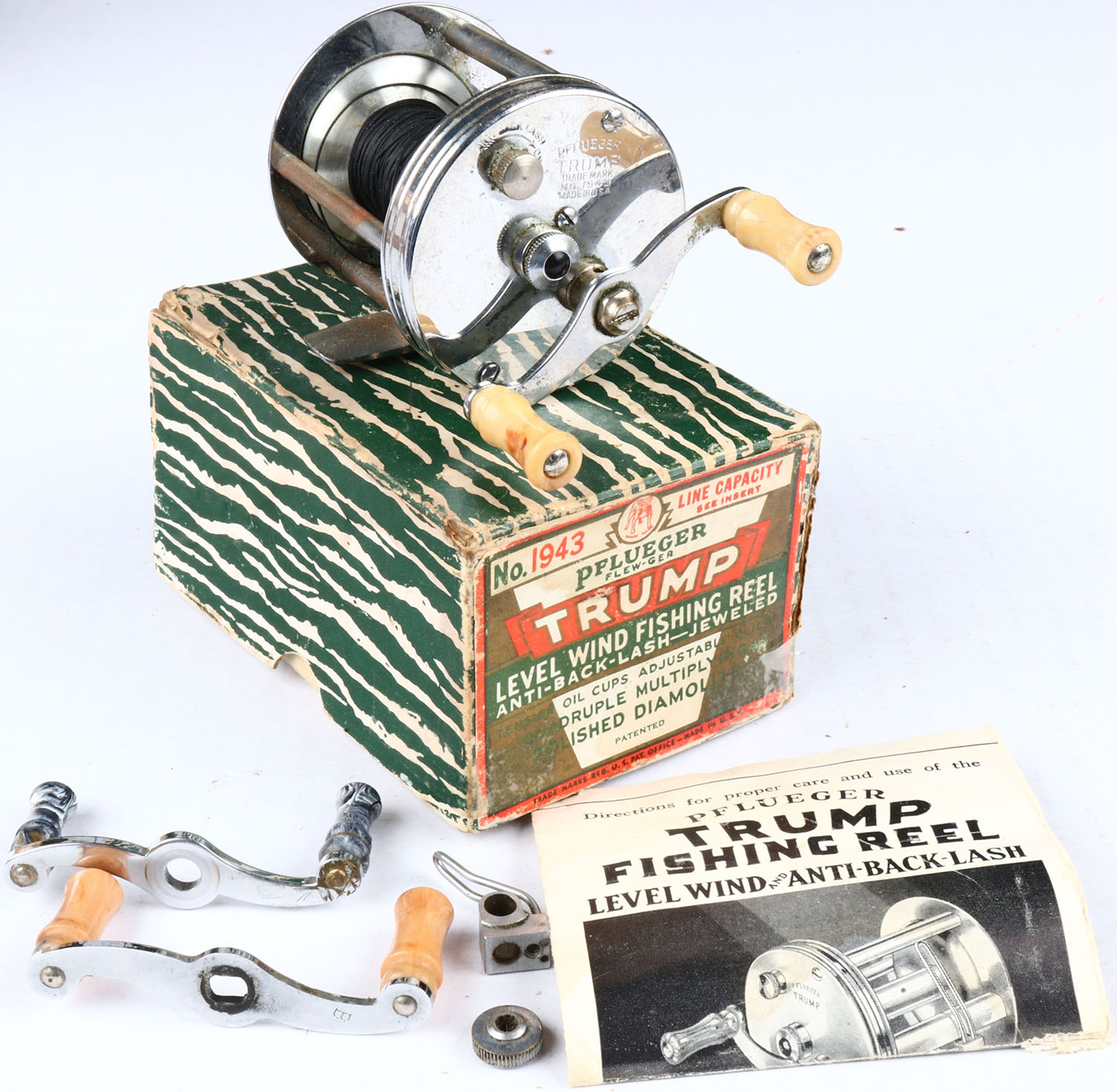 Pflueger Trump, No. 1943 with original box, has spear parts & paperwork, reel is very nice, box is excellent. Grade: Excellent - Value: 10 to 50
