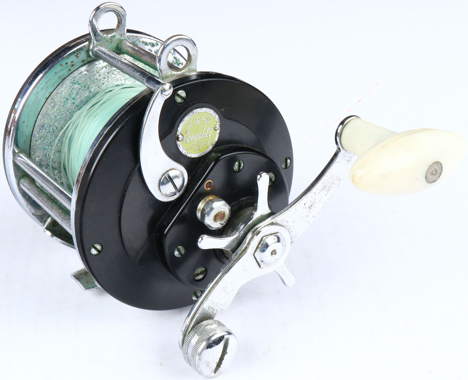 | Ocean City No. 165 surf casting reel, single white handle. Grad...