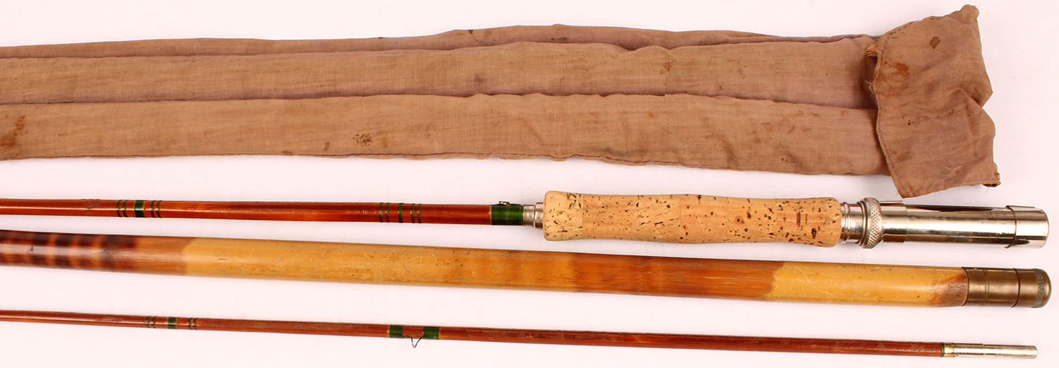Bamboo fly rod marked WINDSOR, 9', 3/2, has bamboo & brass tip holder, cork handle is excellent, all original wraps & all sections are the same length. Grade: Excellent - Value: 20 to 100