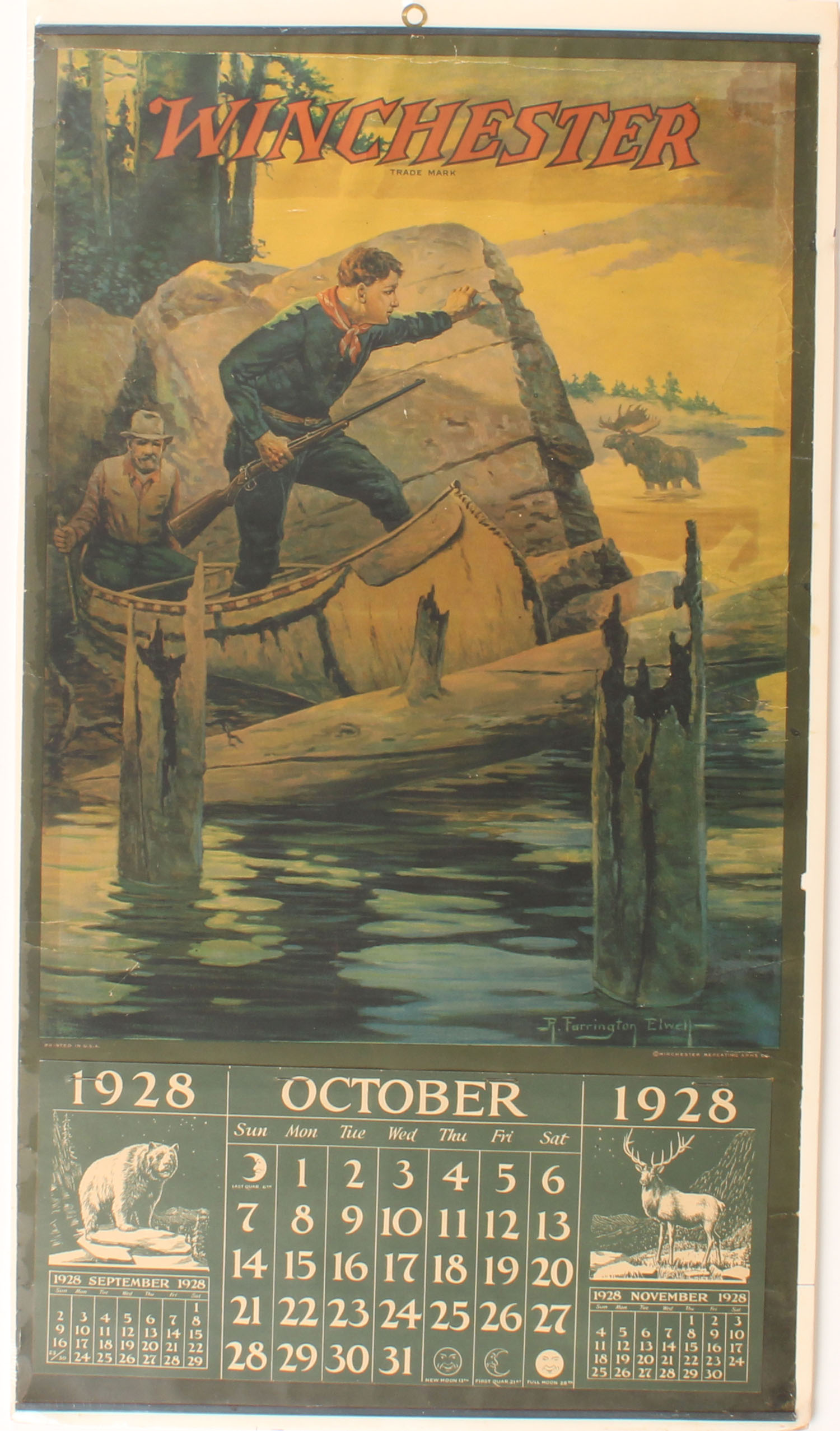 1928 Winchester Calendar, color image of two moose hunters in birch canoe looking at bull moose in lake, artist R. Farrington Elwell, Oct. page, 15'' x 26 5/8'', metal bands top & bottom with brass hanger, calendar shows edge wear & light age soiling. Grade: Very Good ++ - Value: 800 to 2000