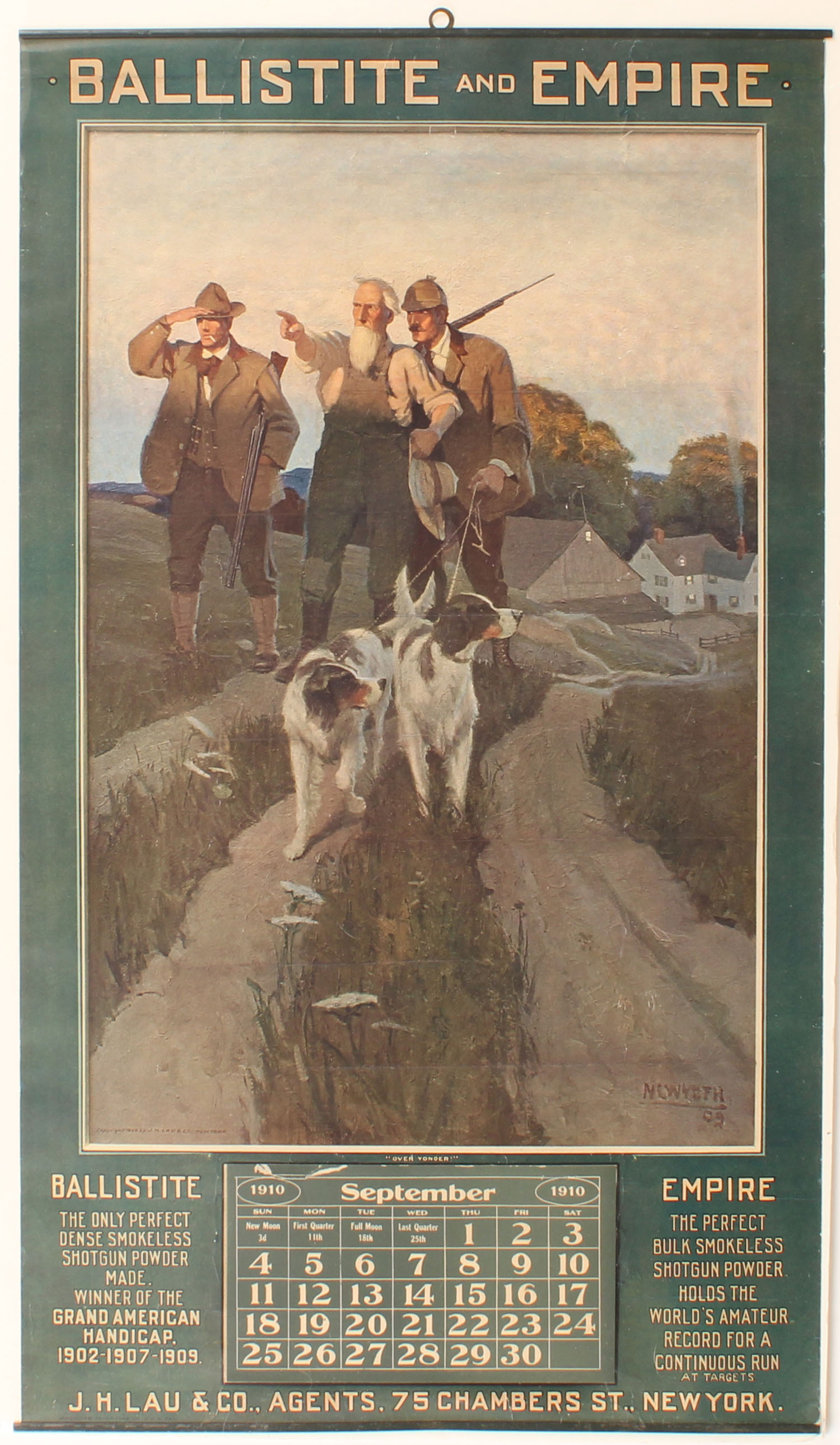 1910 Ballistite Empire Calendar, ''OVER YANDER'', artist N.C. Wyeth, pictures two hunters with dogs, farmer pointing, 15'' x 26'', has metal bands top & bottom with brass hanger, attractive hunting piece, grand american and world amateur championships listed, has very light roll wrinkles that do not detract, almost no wear. Grade: Excellent + - Value: 700 to 1500
