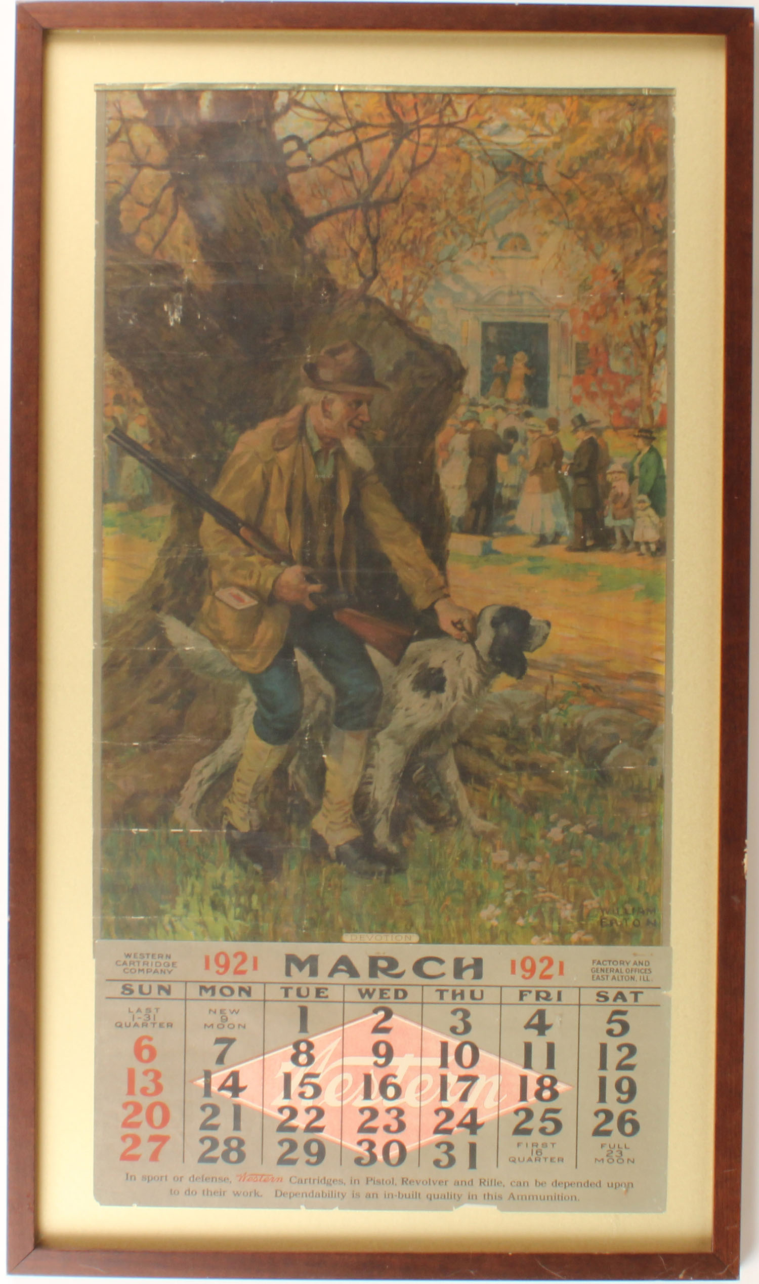 1921 Western Calendar DEVOTION by William Eaton, has full color image of man tying to sneak away from church to go hunting & the dog is about to give him away, has metal band on top, march page, calendar has been attached to back mat, framed, 15'' x 30 1/4'', shows light scuffing with some even age soiling. Grade: Very Good ++ - Value: 400 to 800