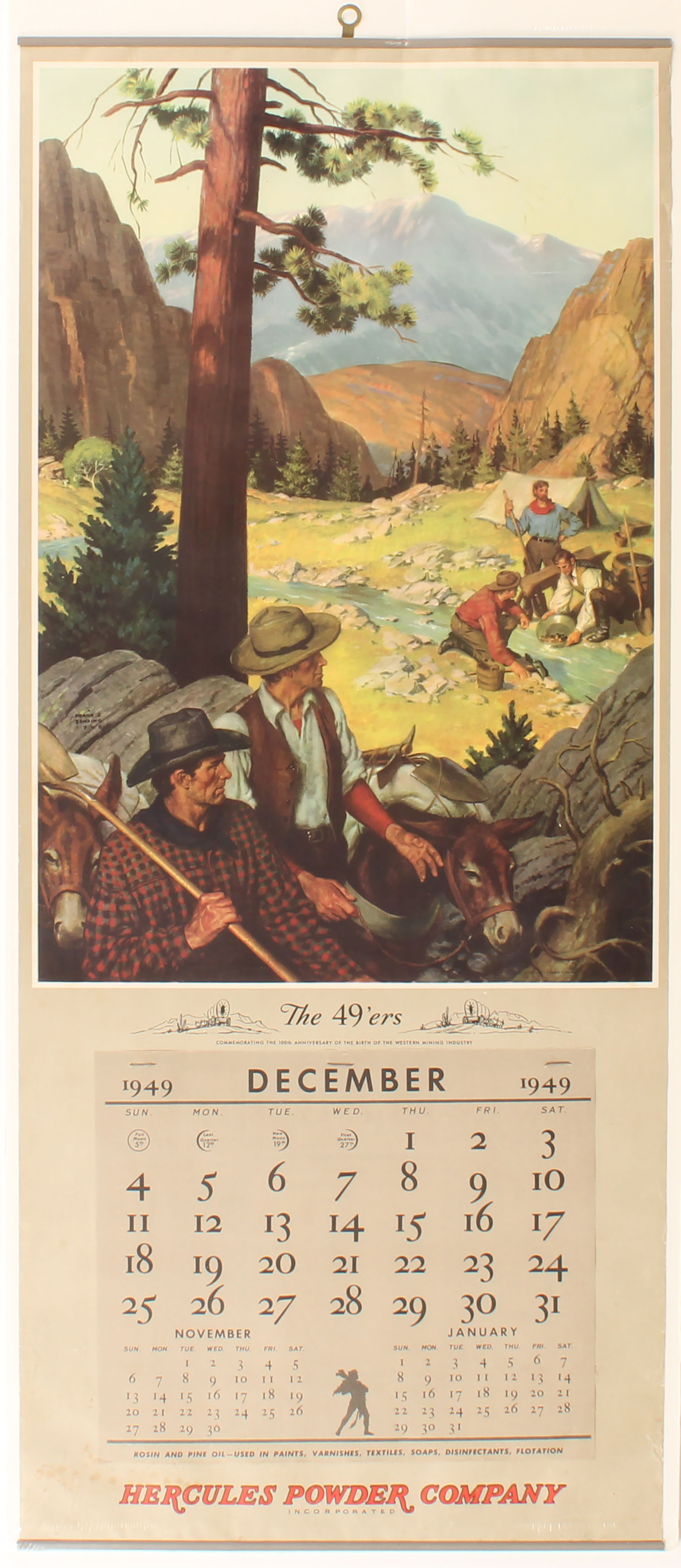 1949 Hercules Powder Co. Calendar, ''THE 49ERS'', commemorating the 100th anniversary of the birth of the western mining industry, gorgeous full color image of a mountain mining cap scene, 13'' x 30 1/2'', Dec. page, metal bands top & bottom with brass hanger, near mint with bright vivid colors. Grade: Excellent + - Value: 200 to 500