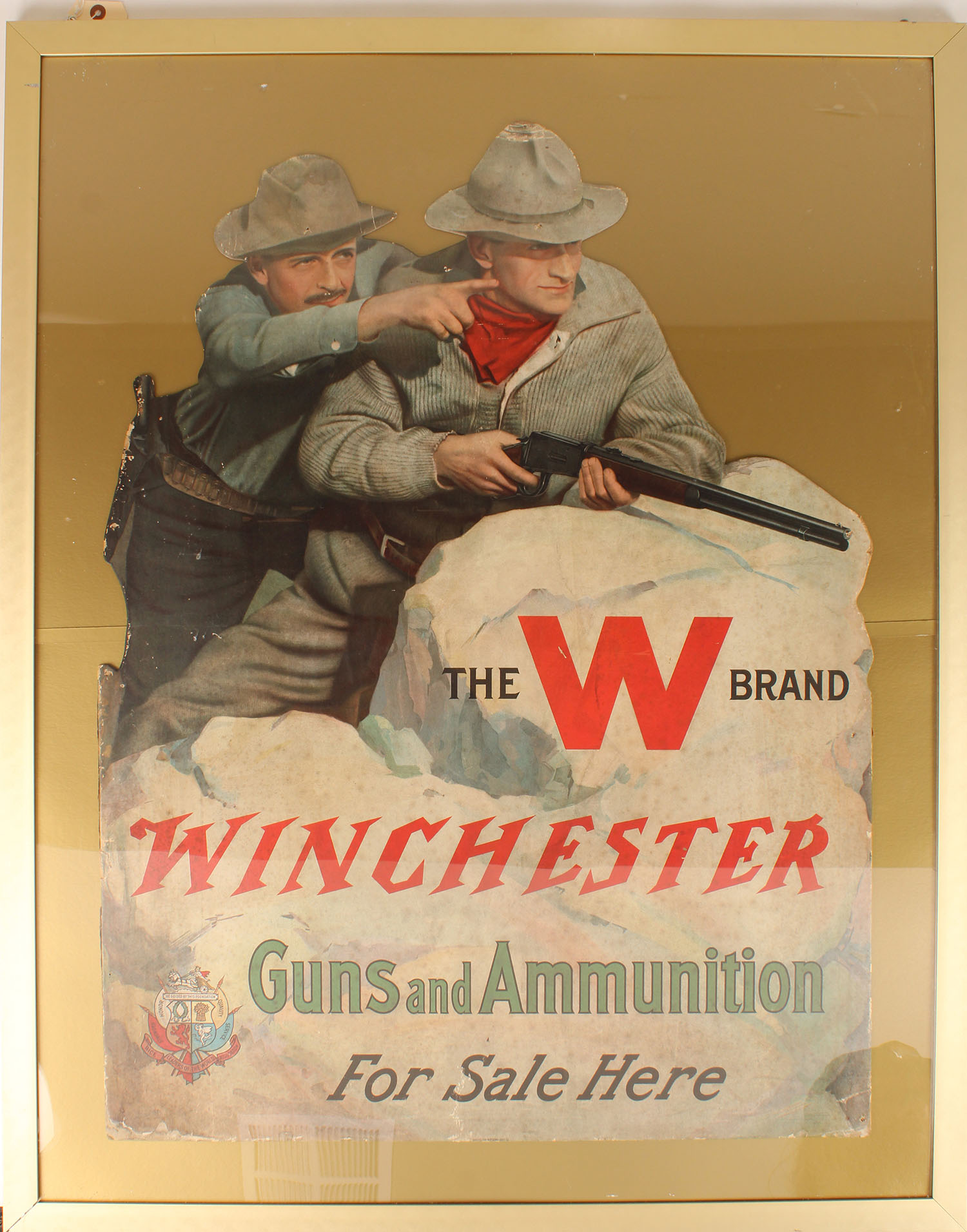 Large Winchester Diecut, ''THE W BRAND WINCHESTER Guns and Ammunition For Sale Here'', this is the center piece, pictures two hunters with a Model 94 leaning over a rock to shoot at big game, show some edge wear with very nice colors, 30'' x 40'', framed, this is a great center piece to any Winchester collection. Grade: Very Good ++ - Value: 800 to 2000