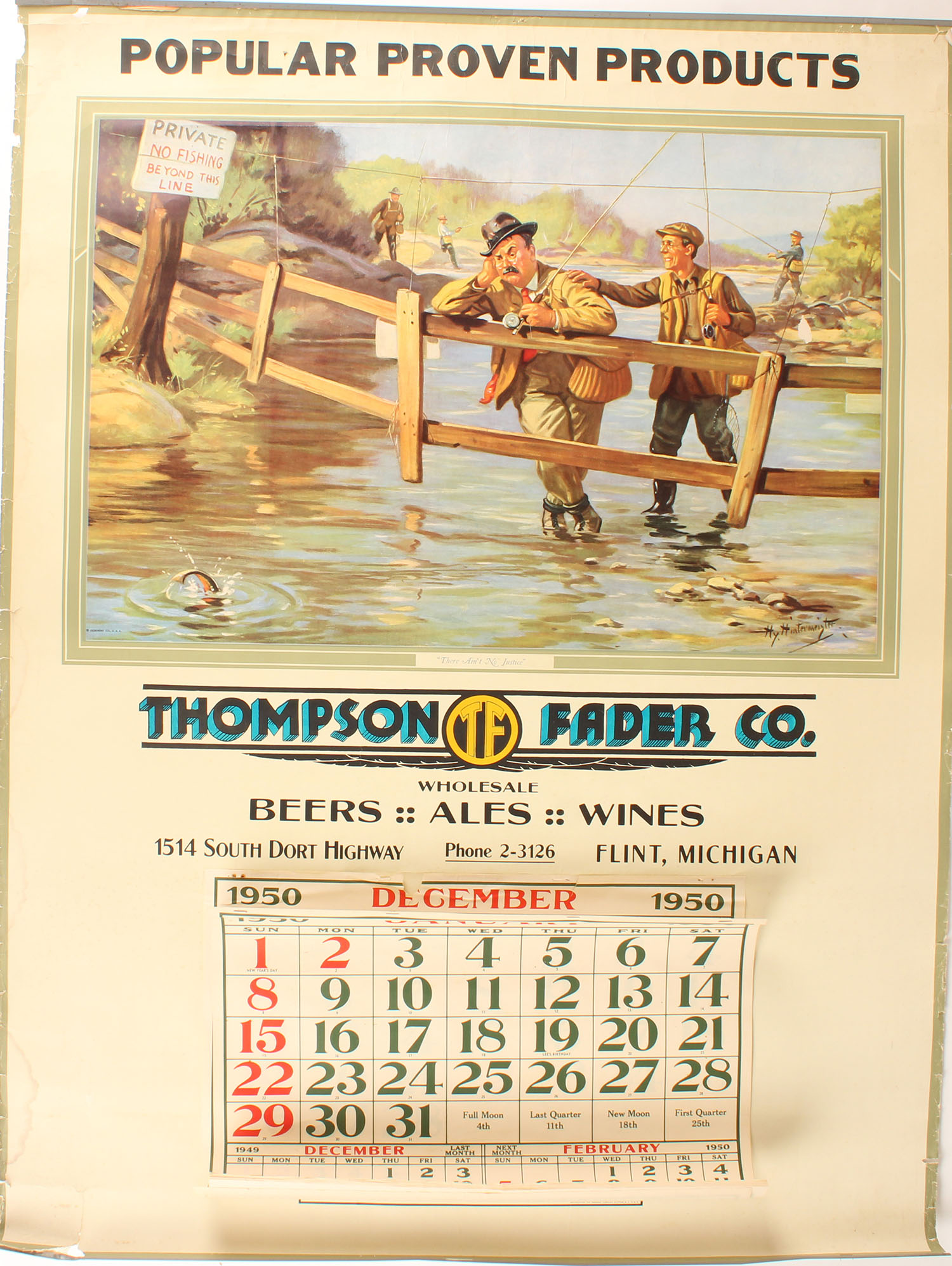 Large Hy Hintermeister calendar pictures fishermen & the one brook trout that got away, 35'' x 47'', has metal bands top & bottom with hanger, full pad of pages. Grade: Very Good ++ - Value: 10 to 100