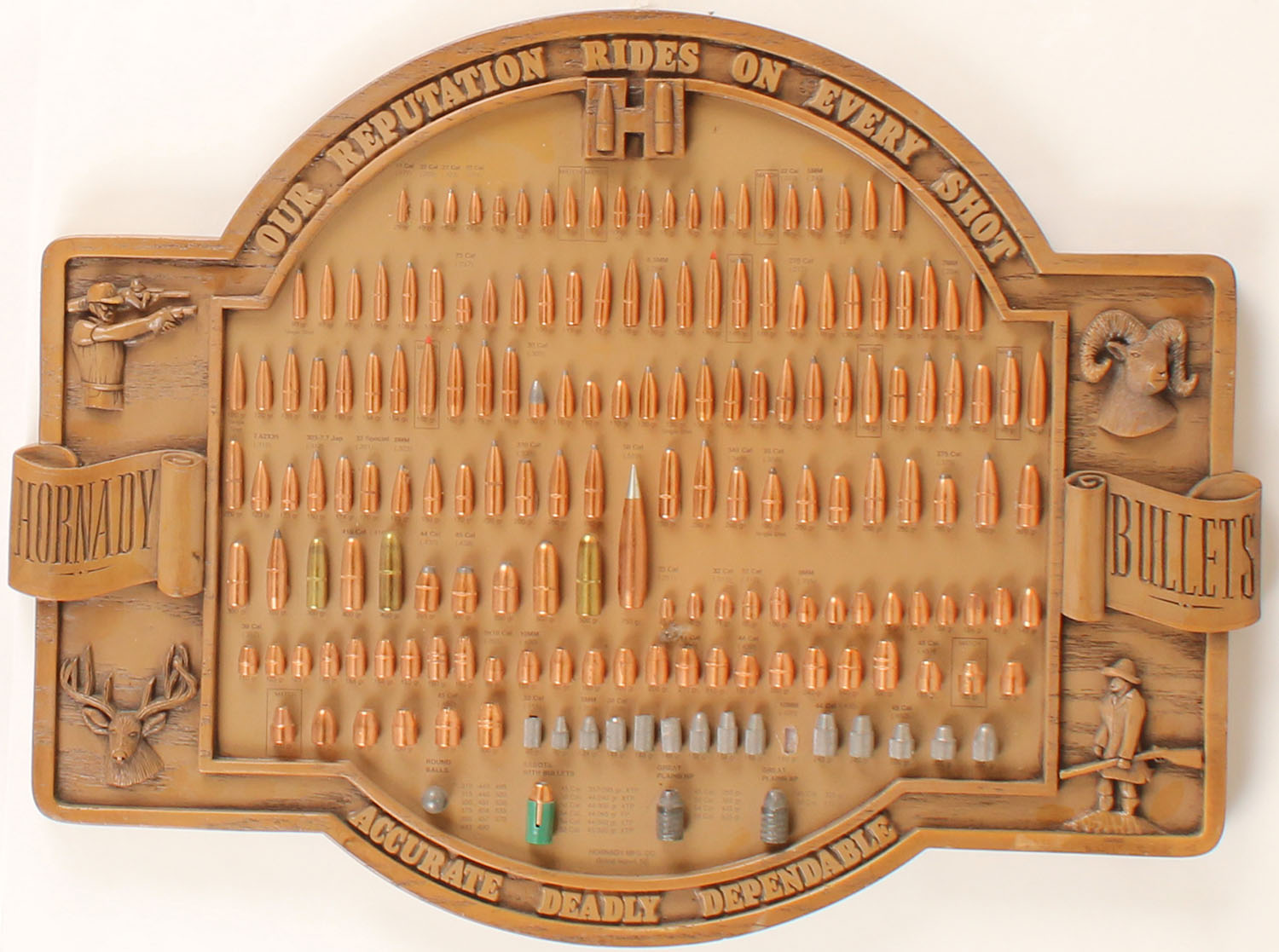 Hornady ''Accurate Dependable Deadly'' Bullet Board, all bullets intact, 22''. Grade: Excellent + - Value: 100 to 300