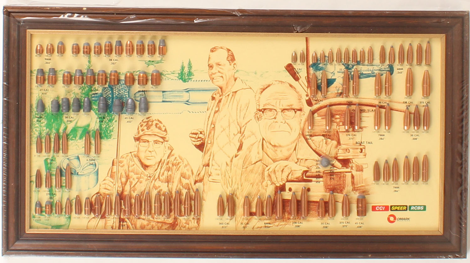 Speer Bullet Board, pictures founders Vernon Speer, Fred Huntington & Richard Speer, all bullets intact, has original wrapping, 21 1/2'' wide. Grade: Excellent + - Value: 100 to 300