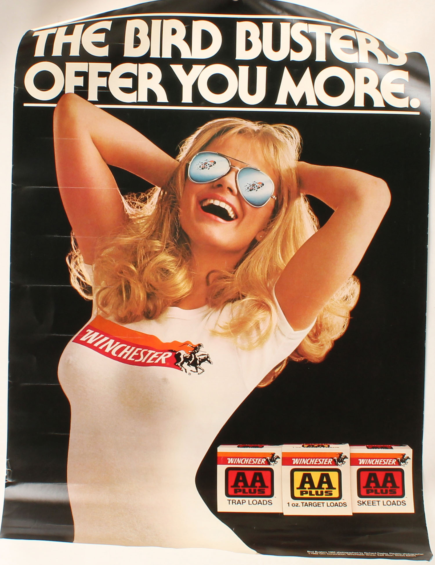 Winchester BIRD BUSTER AA PLUS Poster, pictures a lady in white Winchester t-shirt with sunglass on, 20'' x 28''. Grade: Excellent + - Value: 100 to 300