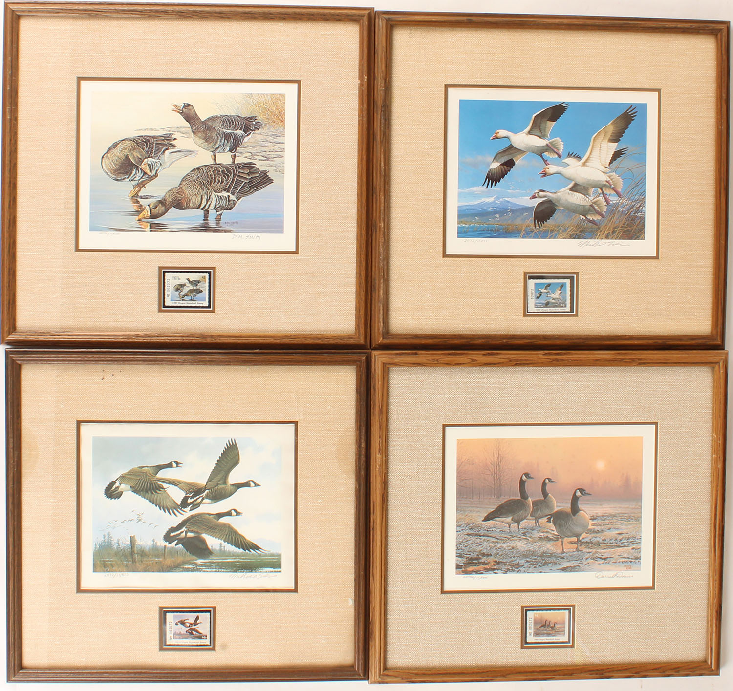 Lot of 4 Oregon State Duck stamps & prints, all are No. 2072/11825, 9'' x 6 1/2'' image size, framed & matted, some show ware. Grade: Very Good ++ - Value: 200 to 300