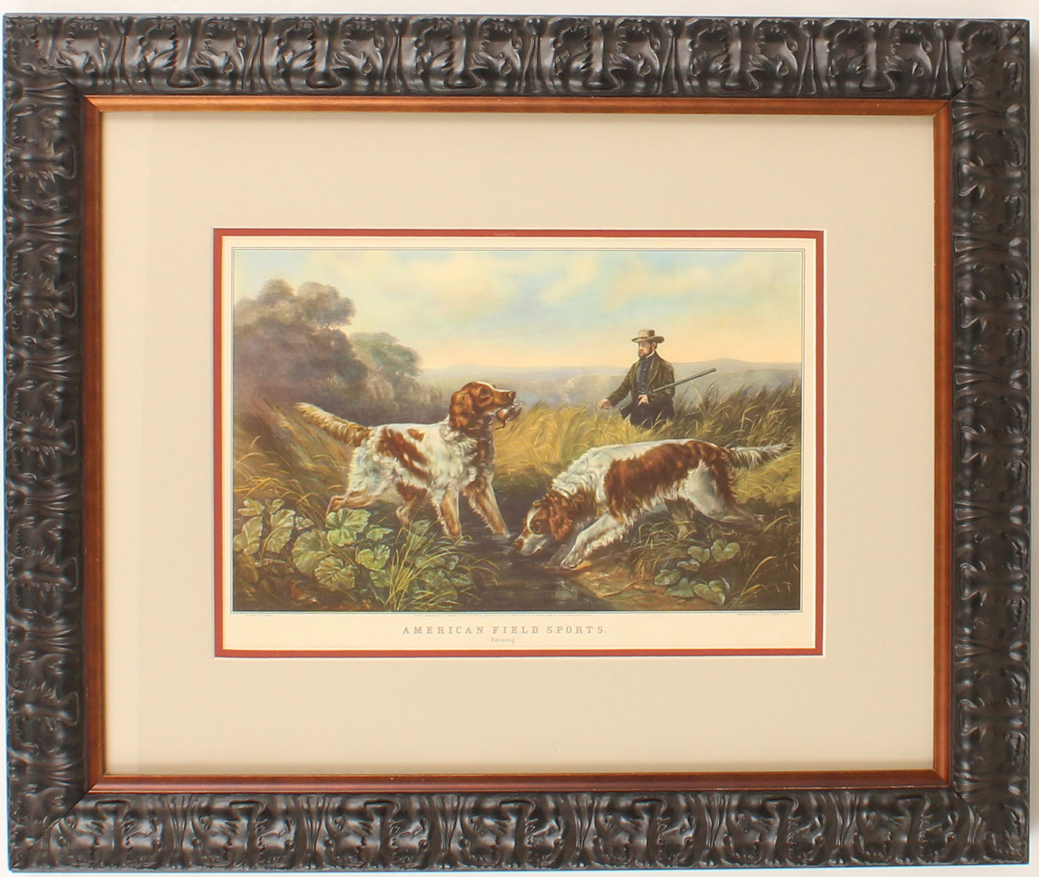 Currier & Ives print ''Retrieving'' American Field Sports, pictures quail hunters with his two dogs, 13'' x 9'' image size, framed & matted. Grade: Excellent - Value: 10 to 100