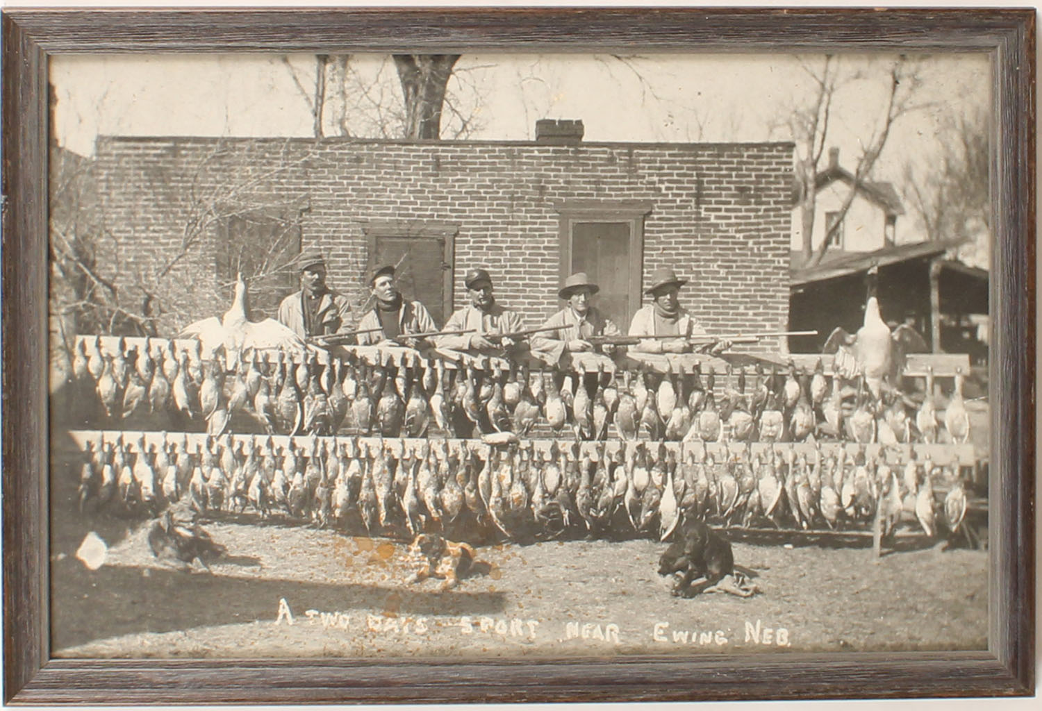 B&W photo of a duck hunt near Ewing Neb. Pictures hundreds of ducks & 5 hunters with shotguns, 19'' x 12'', framed. Grade: Excellent - Value: 10 to 50