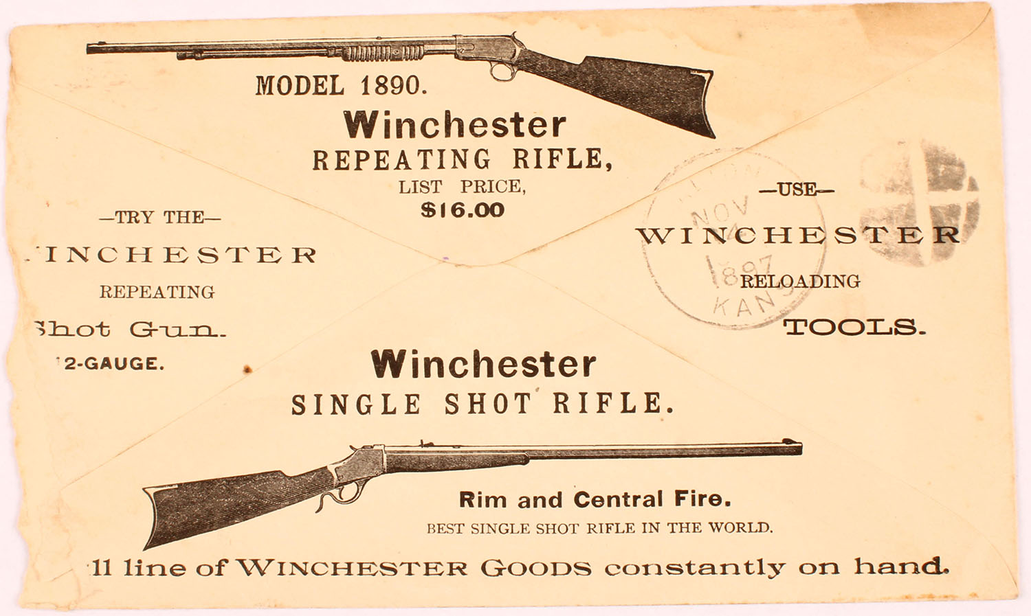 Winchester Repeating Rifles, Single Shot Rifles, Shot guns and Tools Envelope, dated 1897, pictures rifles on back, torn on right side. Grade: Very Good - Value: 10 to 60