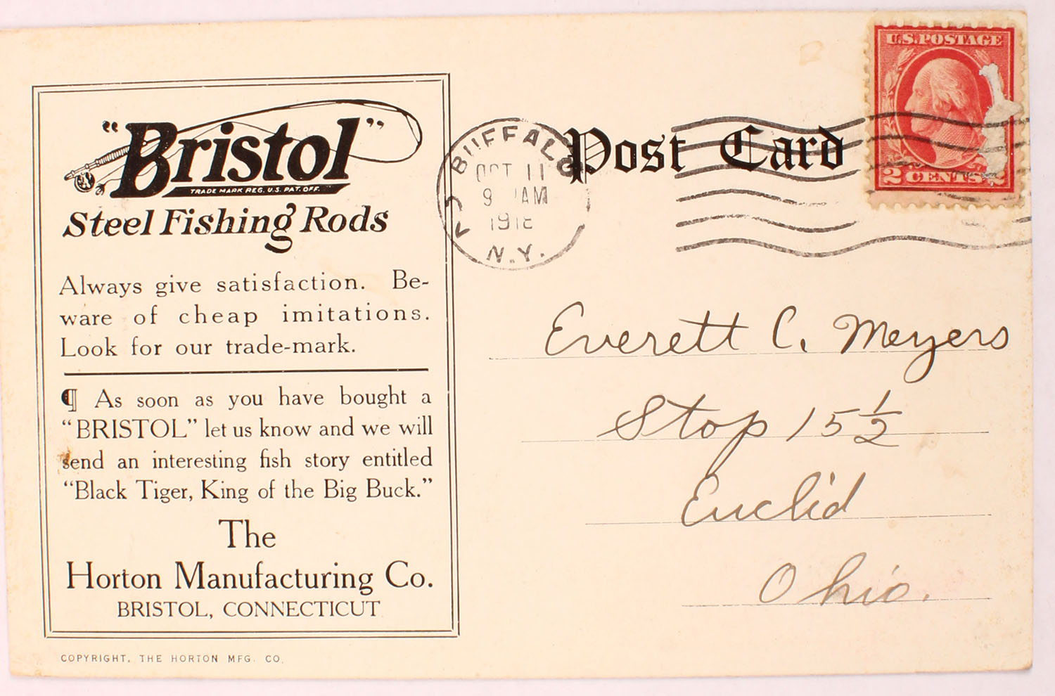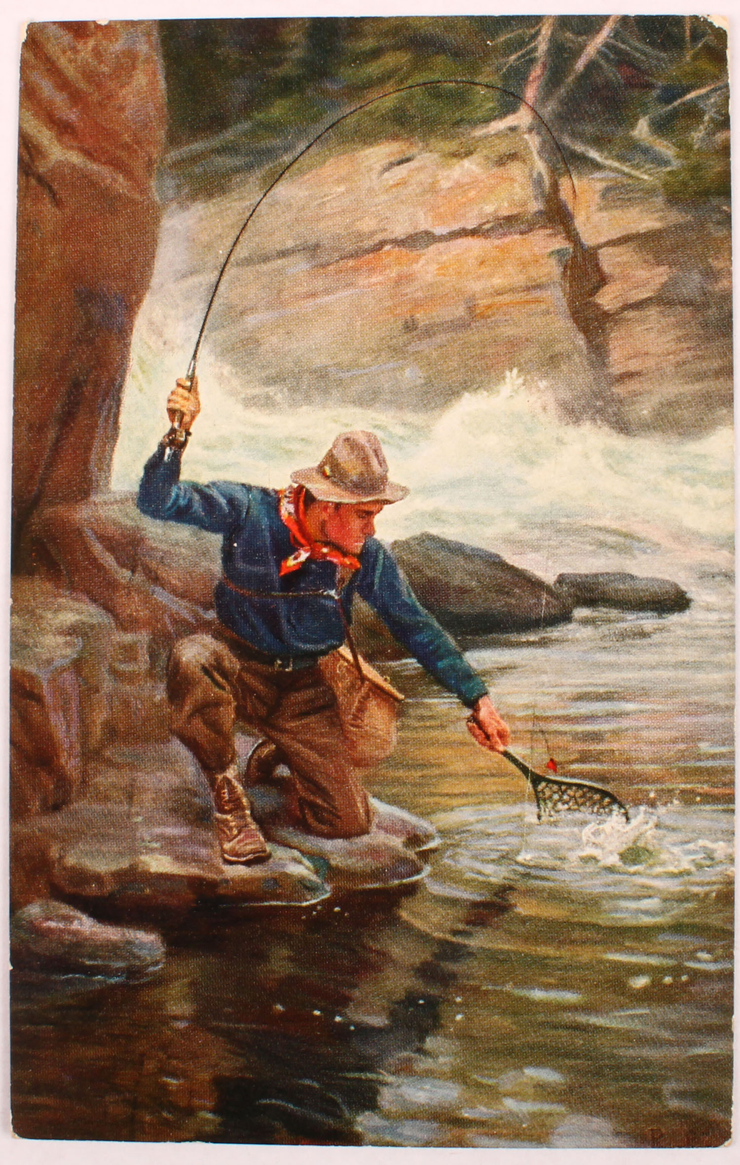 RARE Bristol Steel Fishing Rods Post Card, dated 1918, wonderful full color image of fisherman landing a trout. Grade: Excellent - Value: 30 to 300