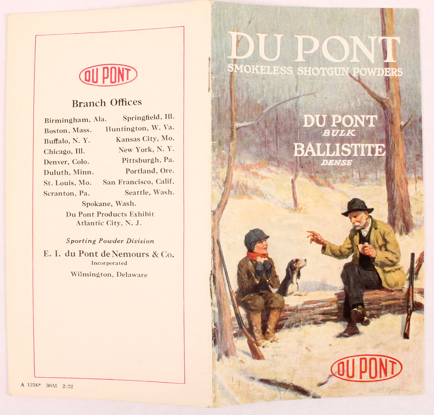 Du Pont Bulk, Ballistite Dense booklet, full color cover pictures father & sone hunting in a snowy scene, 3 1/2'' x 6'', 37 pages, From A 1236* 30M 2-22, Circa 1922. Grade: Excellent ++ - Value: 10 to 100