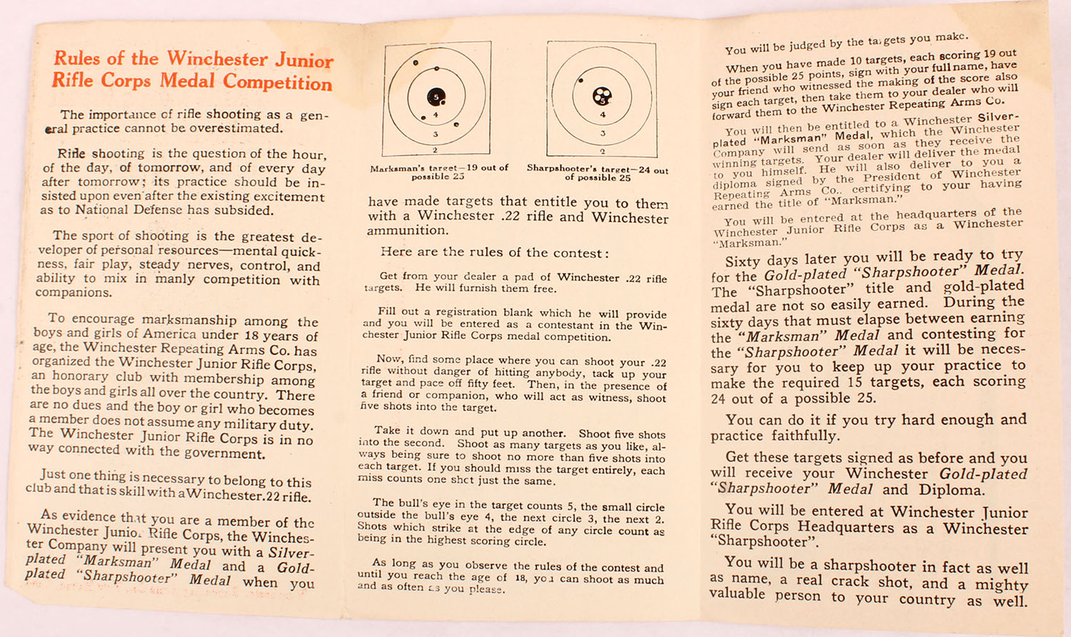 Winchester Junior Rifle Crop tri-fold brochure, ''Rules of the Winchester Junior Rifle Corps Medal Competition'', 3 1/2'' x 6 1/4'', many .22 rifles are pictured. Grade: Excellent - Value: 10 to 100