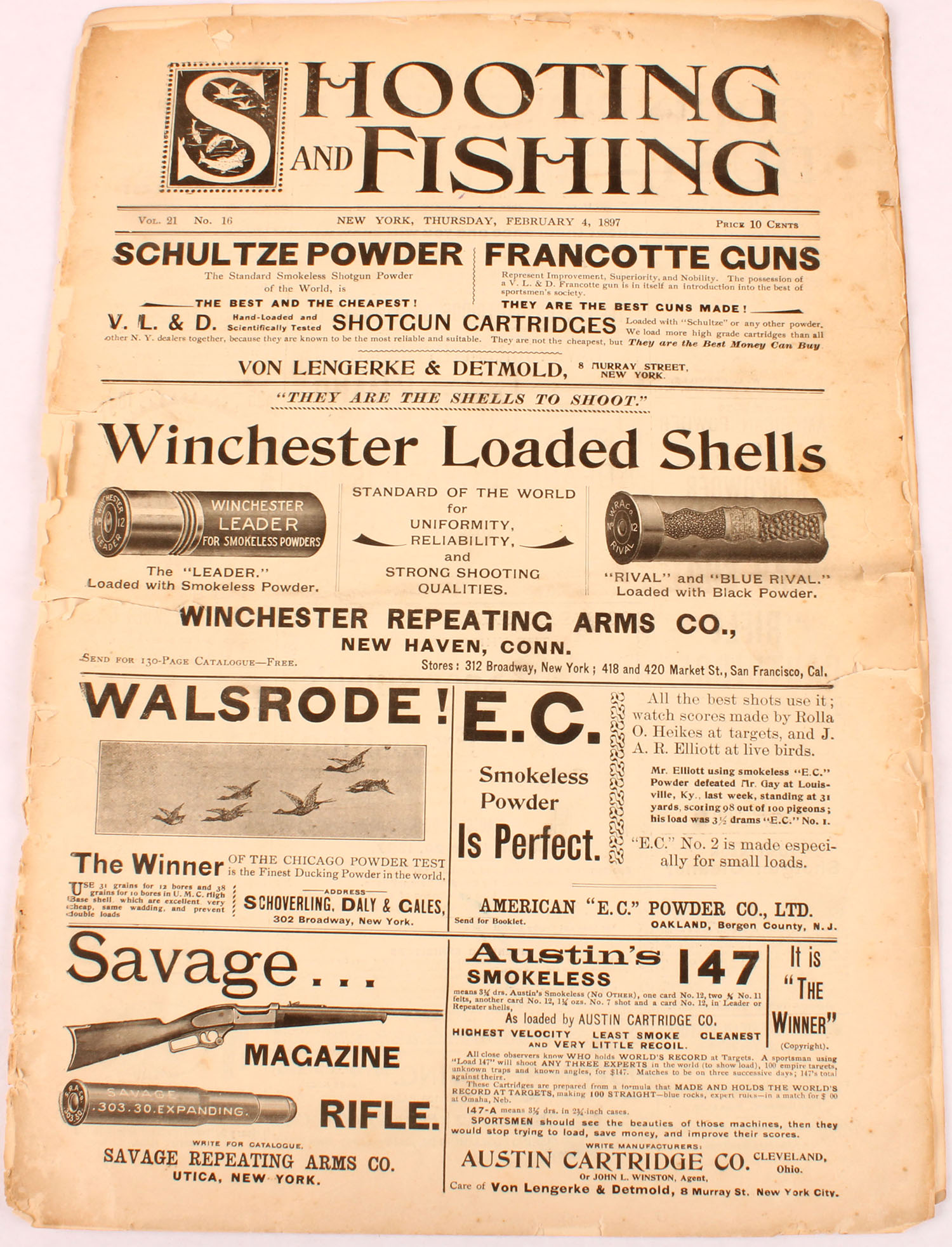 1897 Shottong & Fishing Magazine, many images of guns, ammo & fishing, 15 1/2' x 15'', about 14 pages. Grade: Good ++ - Value: 2 to 30