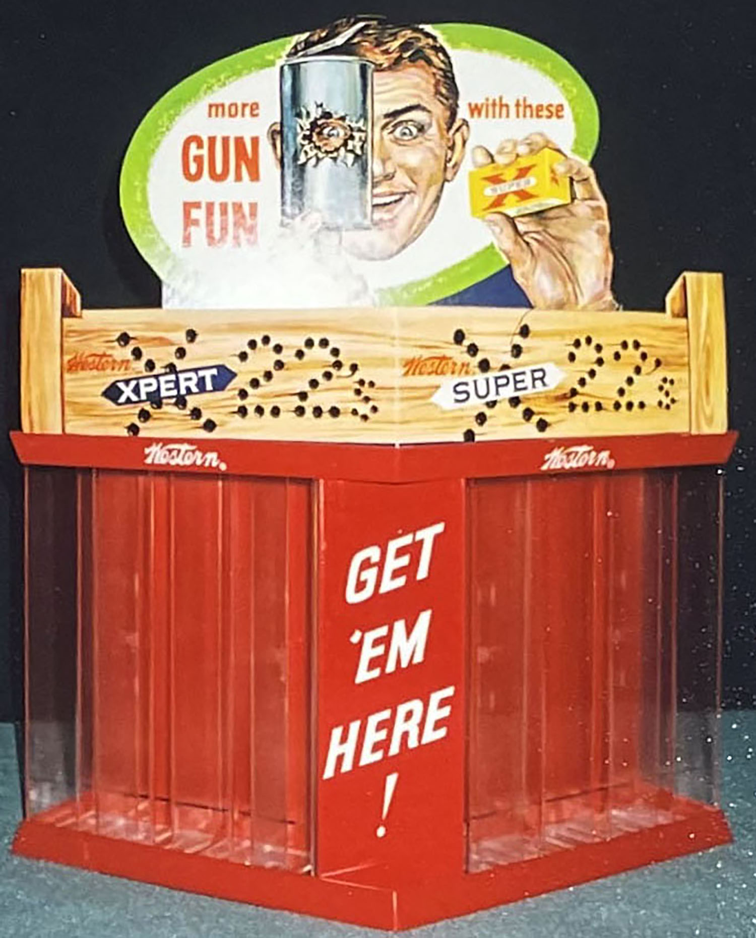 RARE Western SUPER-X & XPERT .22 3D display, SEALED IN ORGINAL BOX WITH MINT DIECUT ON TOP, the photos are used from an other box that we opened, ''GET 'EM HERE!'', two sided display holds many .22's for your collection, the diecut on top pictures a man holding a tin can with a large hole in it plus a .22 box, Grade: MINT - Value: 1000 to 2000