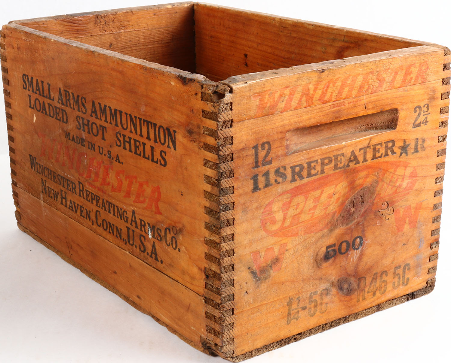 Winchester Repeater Speed Loads, 12 Ga. 1 1/4 - 5C, tongue and groove construction wood shipping crate, black & Red print has some fading, crate has minor dings & is overall solid. Grade: Very Good + - Value: 20 to 80