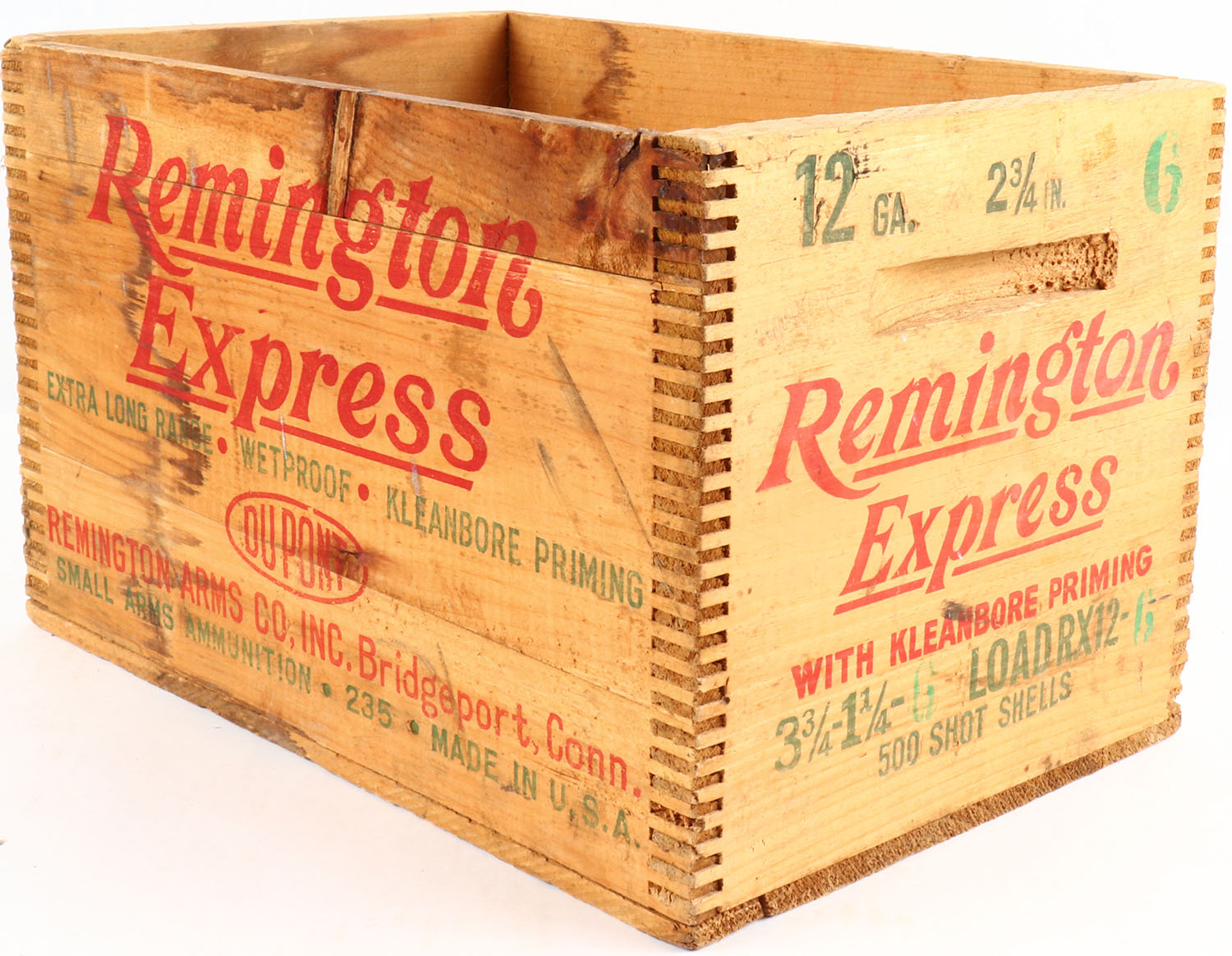 Remington Express, 12 Ga., 6 shot, nail construction, red, & green print is solid and crate has bright and clean. Grade: Excellent + - Value: 10 to 50