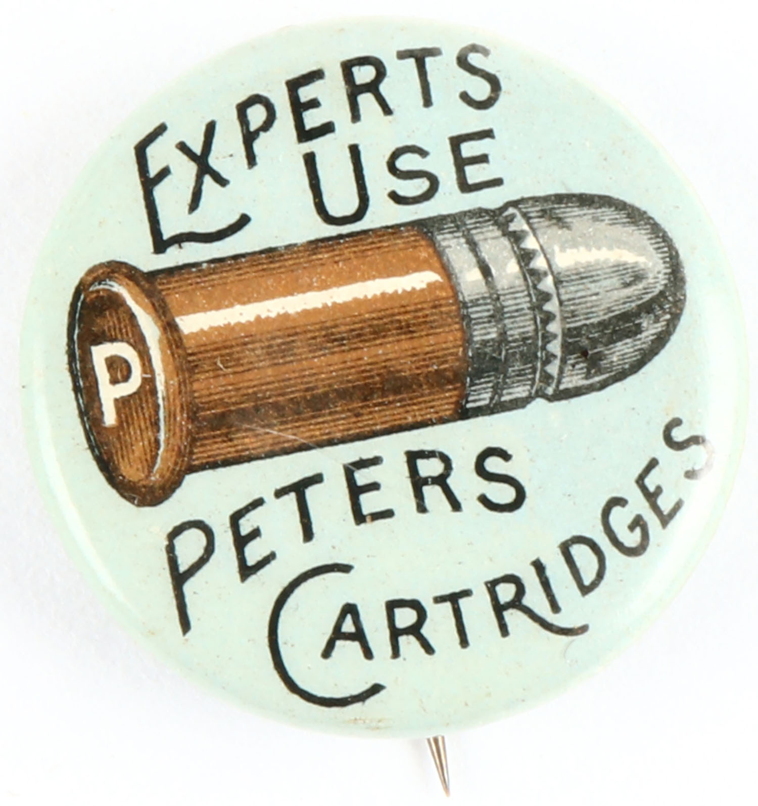 Peters Pinback, pictures a 22 cart., ''Experts Use Peters Cartridges'' 7/8'', Whitehead & Hoag Co. paperback, pin is clean & paperback shows minor wear. Grade: Excellent - Value: 20 to 60
