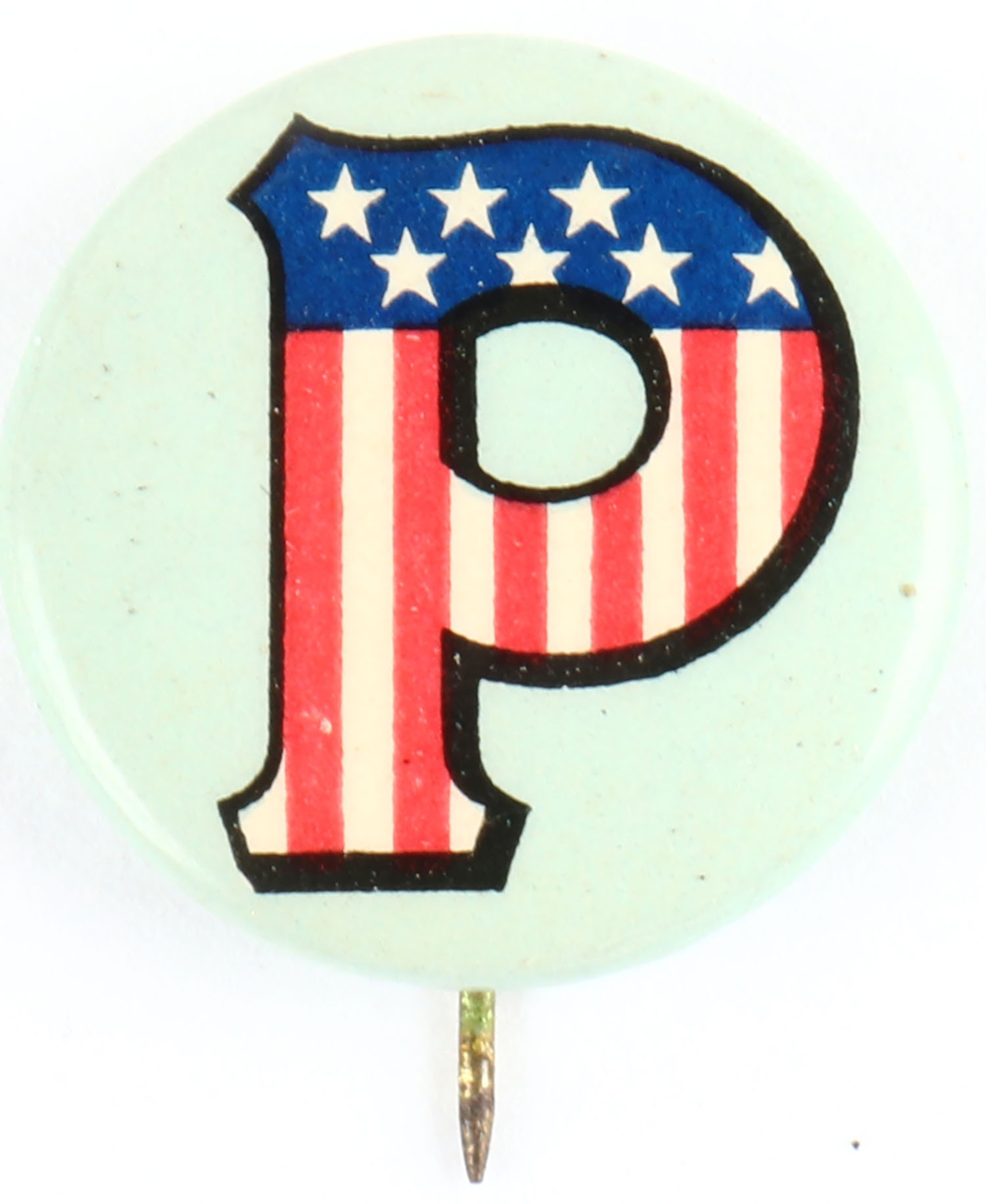 Peters pinback, image of large P with stars & stripes, 7/8'' diameter, Peters pinback, pin & paperback are bright & clean. Grade: Excellent + - Value: 10 to 40