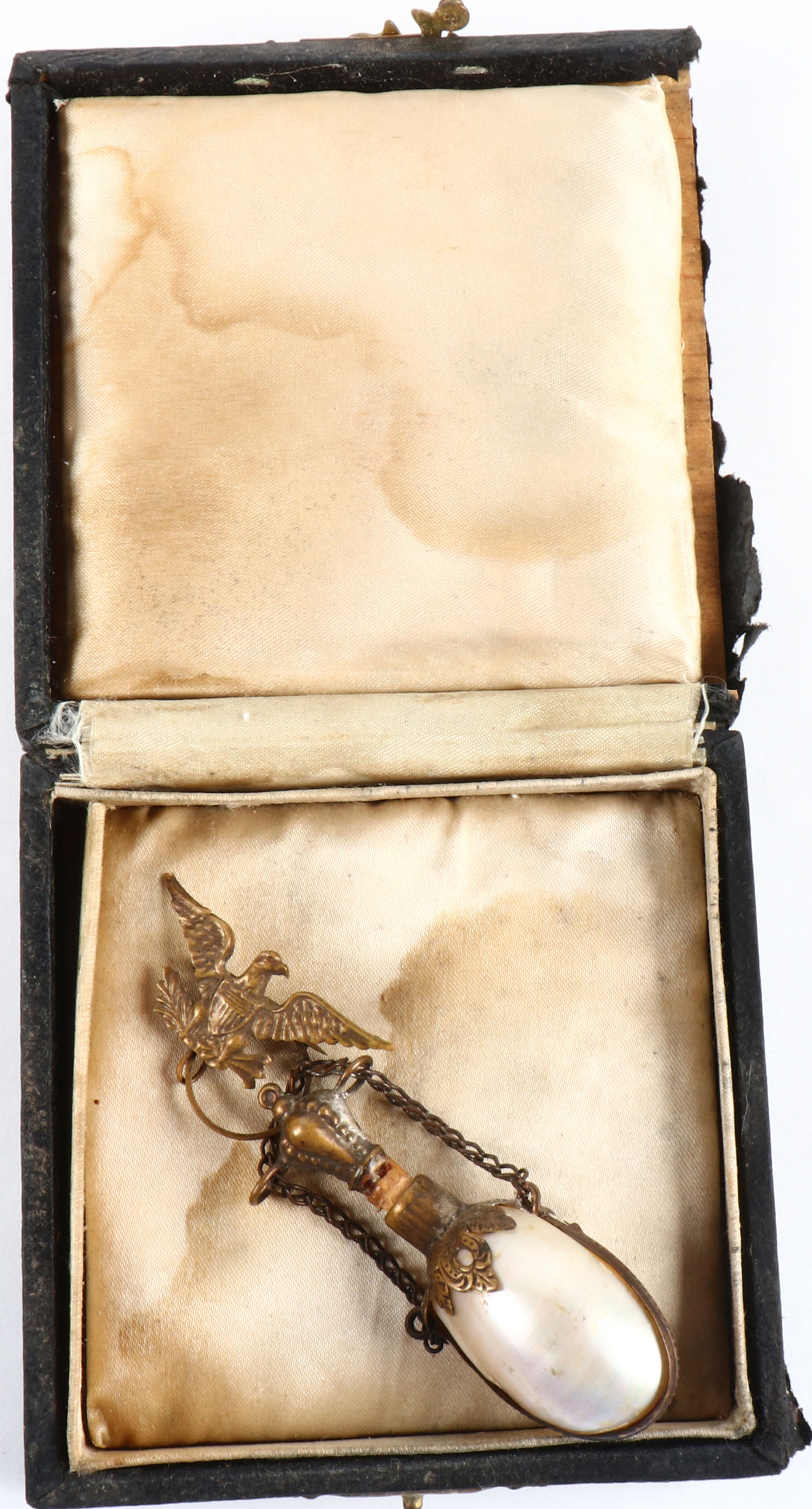 Order of the Eastern Star Pearl of Orient. removable cork top, American eagle on top with pin in the back. Grade: Excellent - Value: 50 to 300