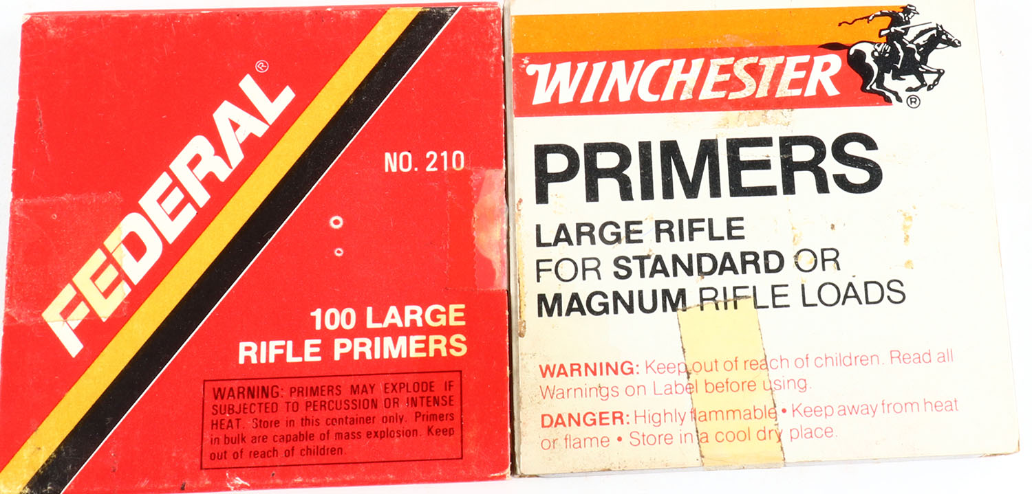 Lot of 2 primer boxes, both partial, both have age soiling. Grade: Very Good - Value: 2 to 20