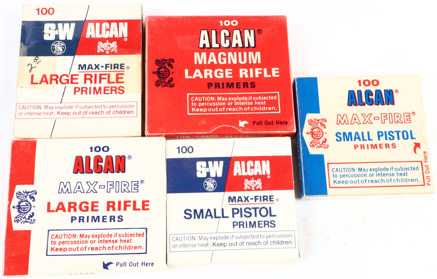 Lot of 5 primer boxes, all full, both have age soiling. Grade: Very Good - Value: 4 to 60