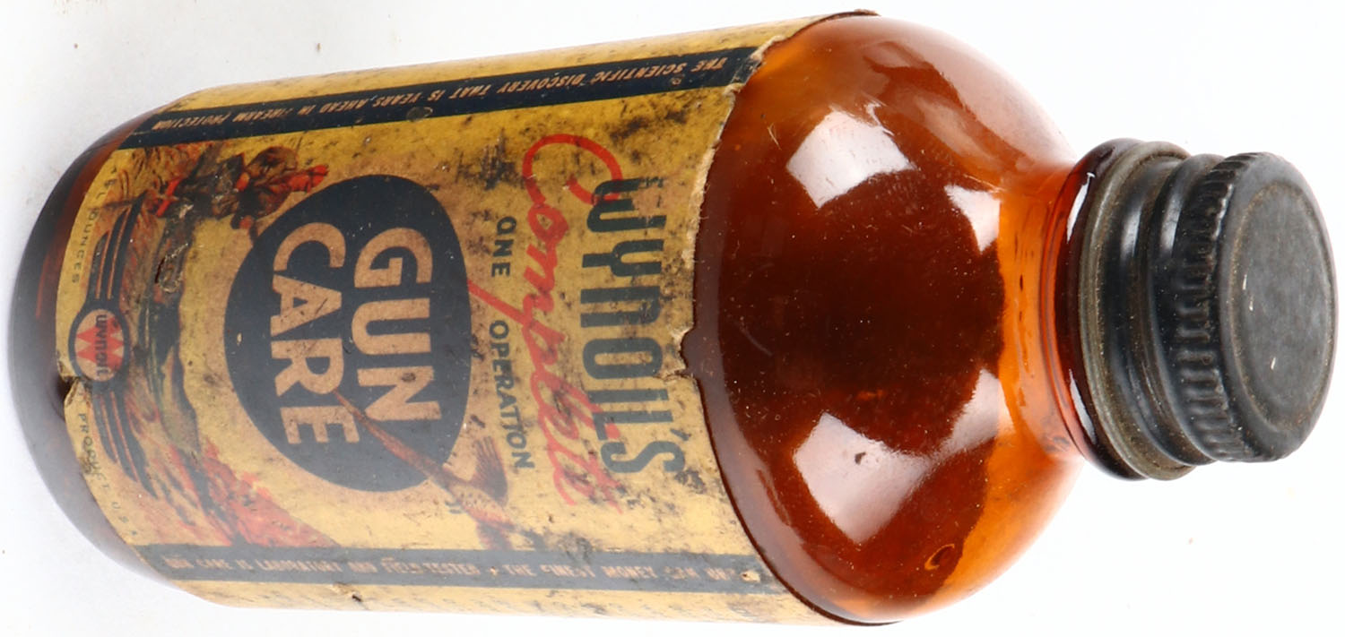 RARE! Wynoils Complete Gun Care oil jar, partial, has age soiling but label is still intact. Grade: Very Good - Value: 100 to 500