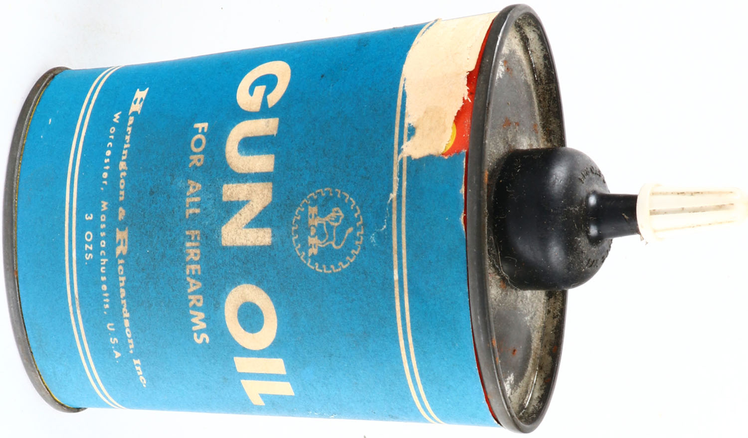 Harrington & Richardson Gun oil tin, Nearly Full, has some scuffing and age soiling. Grade: Very Good ++ - Value: 10 to 100