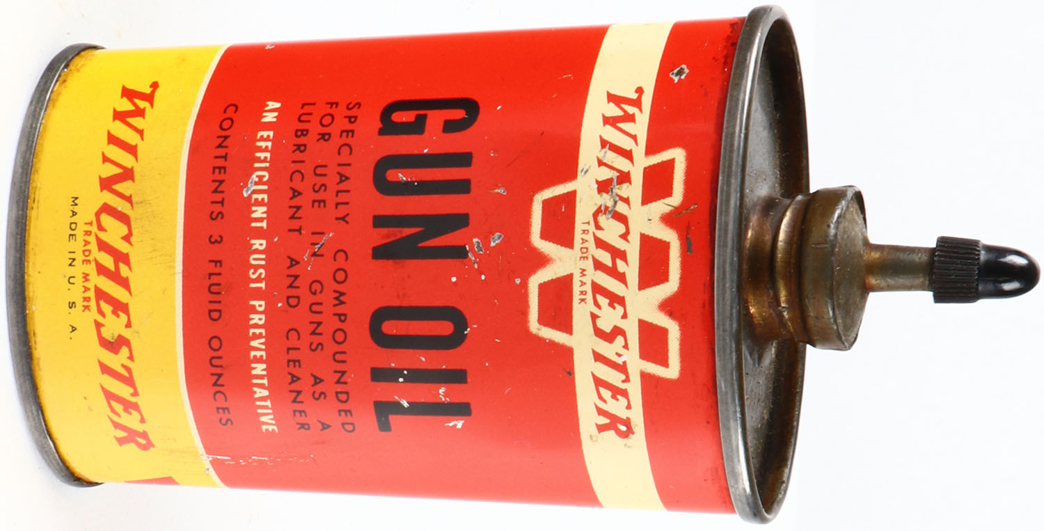 Winchester Oil Tin, Gun Oil, lead spout & plastic cap, partial, very bright and clean. Grade: Excellent - Value: 20 to 60