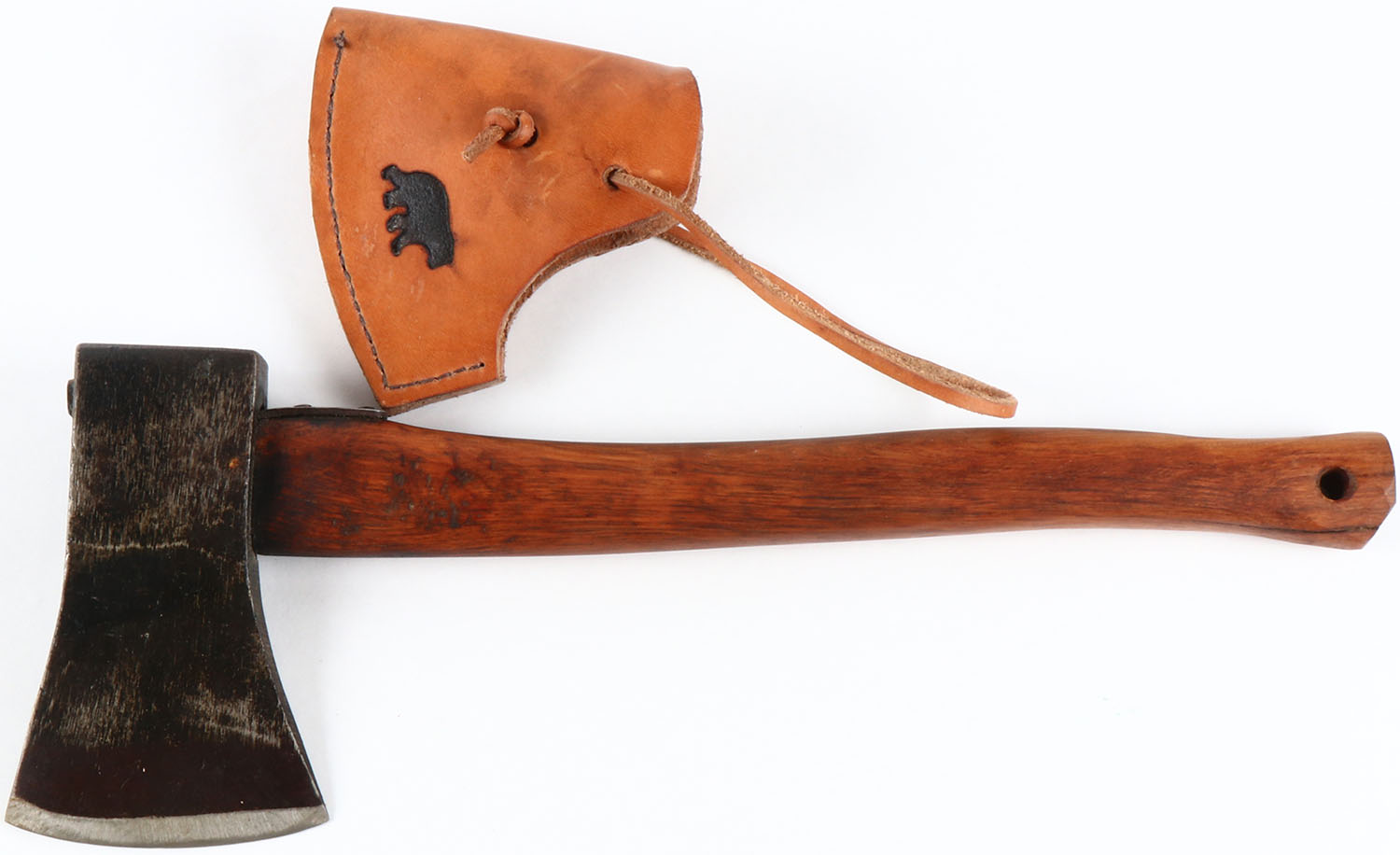 Unmarked hatchet, wood handle, sharp edge, has leather sheath. Grade: Excellent - Value: 30 to 90