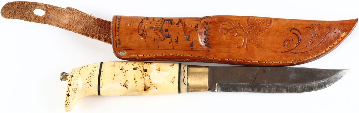 Unmarked made in Norway knife, bone handle with design, 4 1/2'' fixed blade knife, has leather sheath. Grade: Excellent - Value: 30 to 90